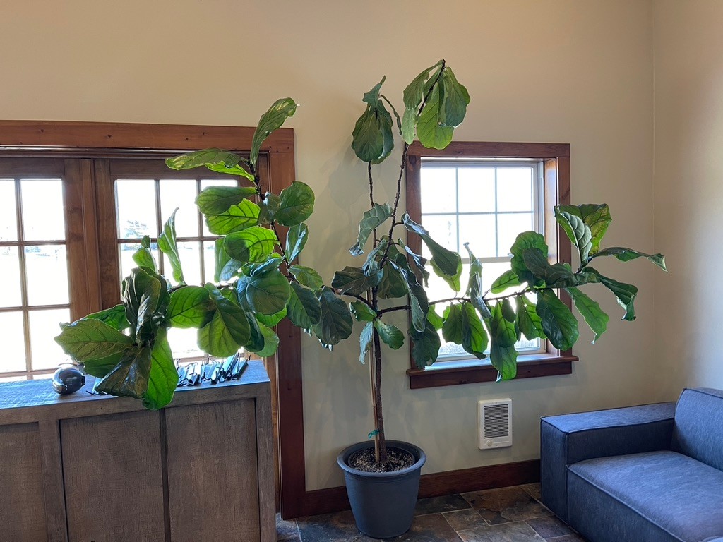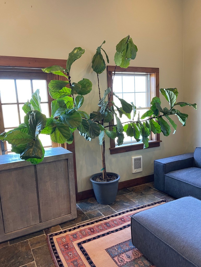 Striking live fiddle leaf fig tree featuring large, sculptural leaves and a natural branching form. Known for its bold presence and modern appeal, this popular indoor plant makes an eye-catching statement in any room.