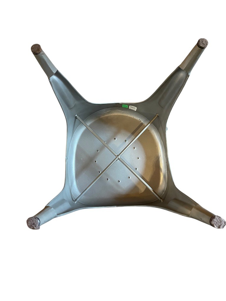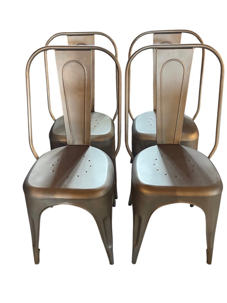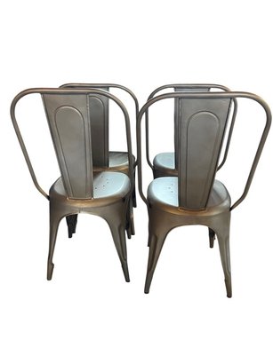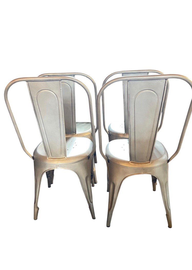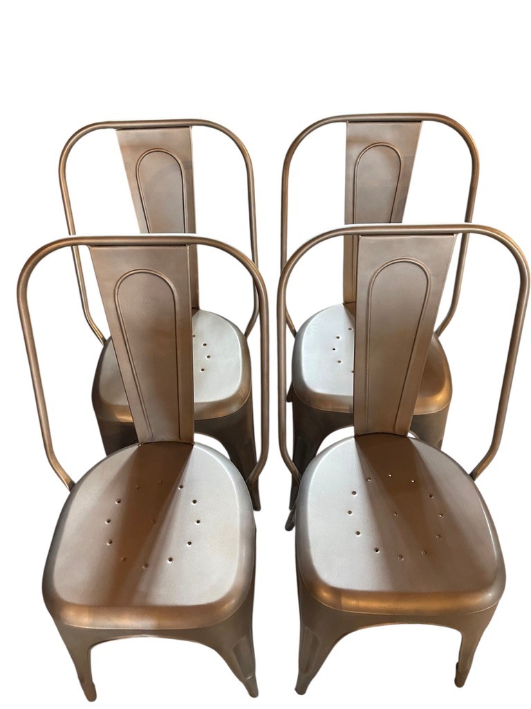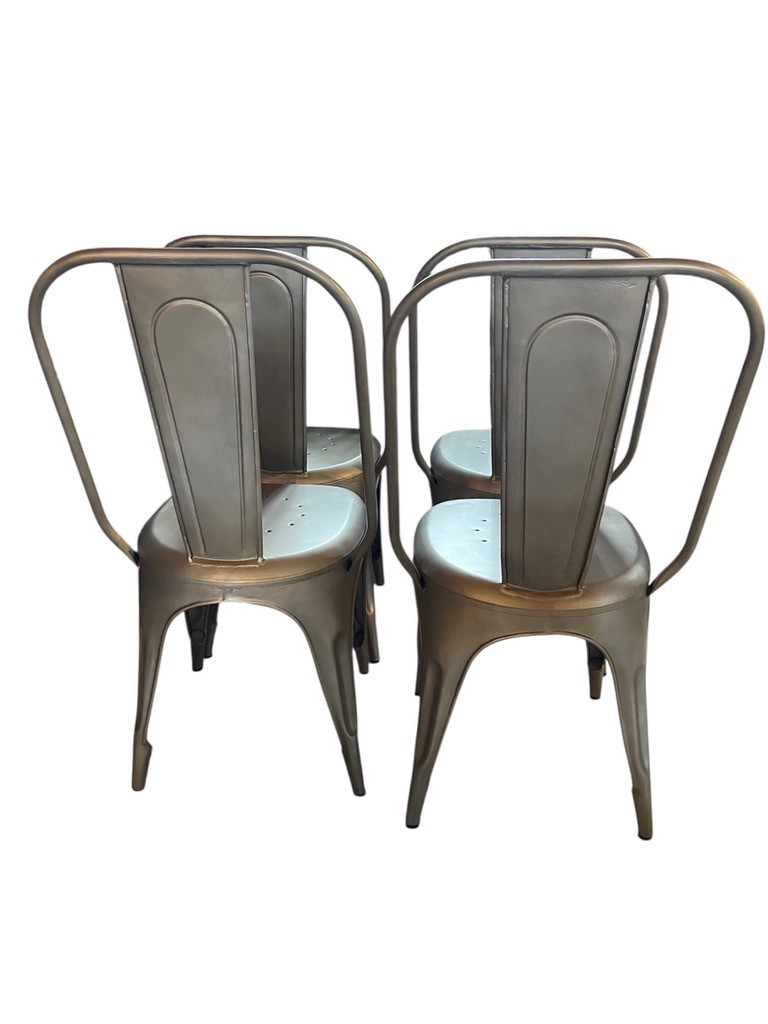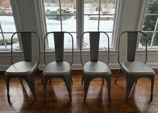 Set of Four RH Industrial-Style metal dining chairs inspired by the classic Tolix design. Featuring a streamlined silhouette with a curved backrest, integrated support bar and perforated seat. Finished in a brushed metallic tone, they bring a clean, modern-industrial look that works well in kitchens, dining spaces, or loft-style interiors. Lightweight yet sturdy, these chairs are practical for everyday use and easy to incorporate into a variety of décor styles. The length measurement is from the widest part of the back of chair.