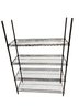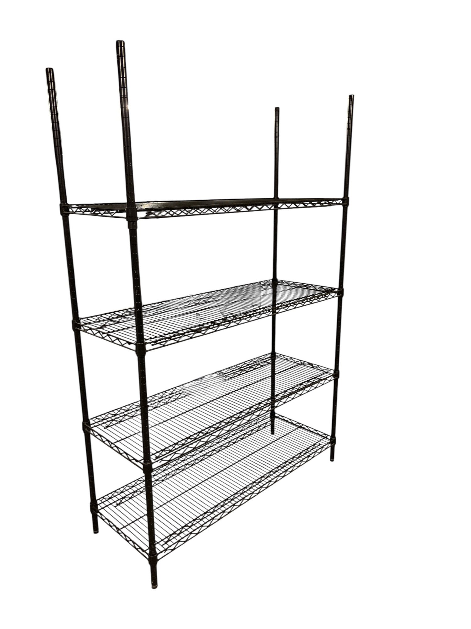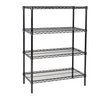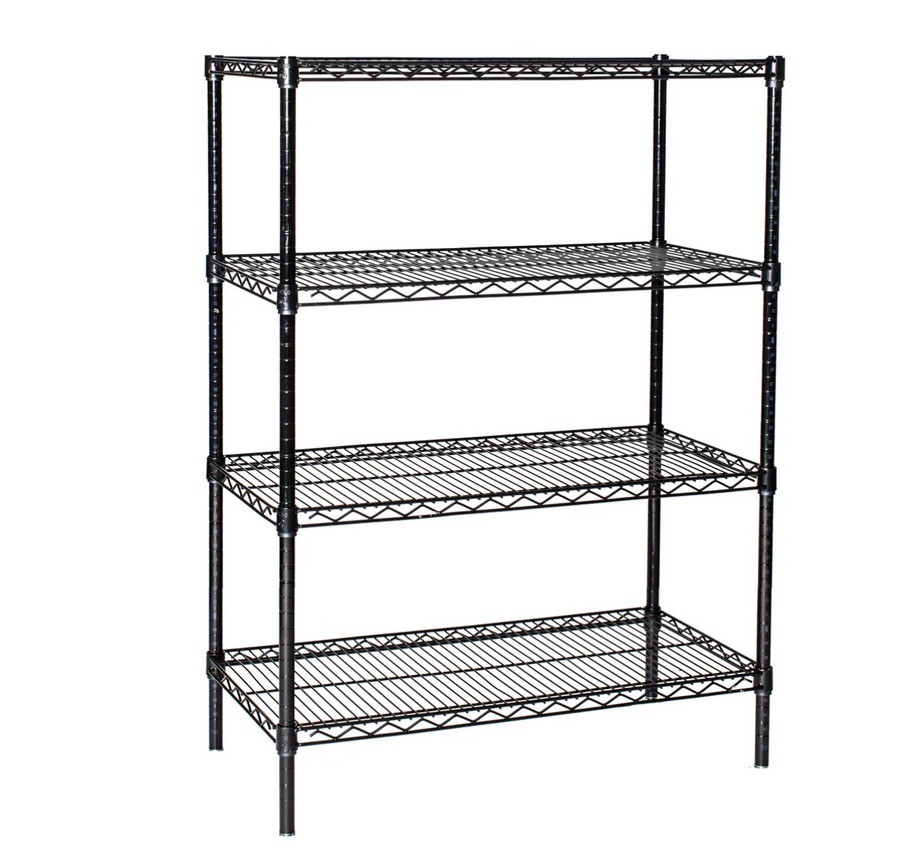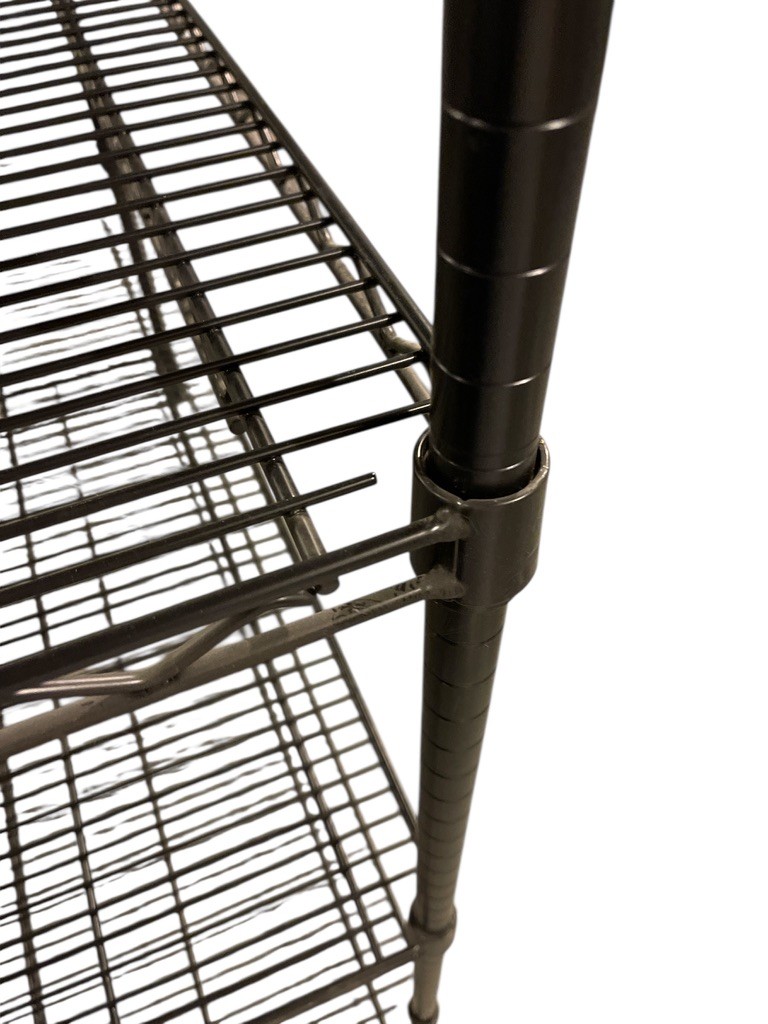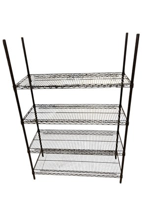 Professional black wire shelving unit with four adjustable tiers ideal for storage, restaurants, retail, office or general organization. Racks were used in a clean basement for storage of linens, toys and miscellaneous household products.
