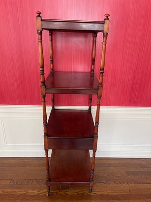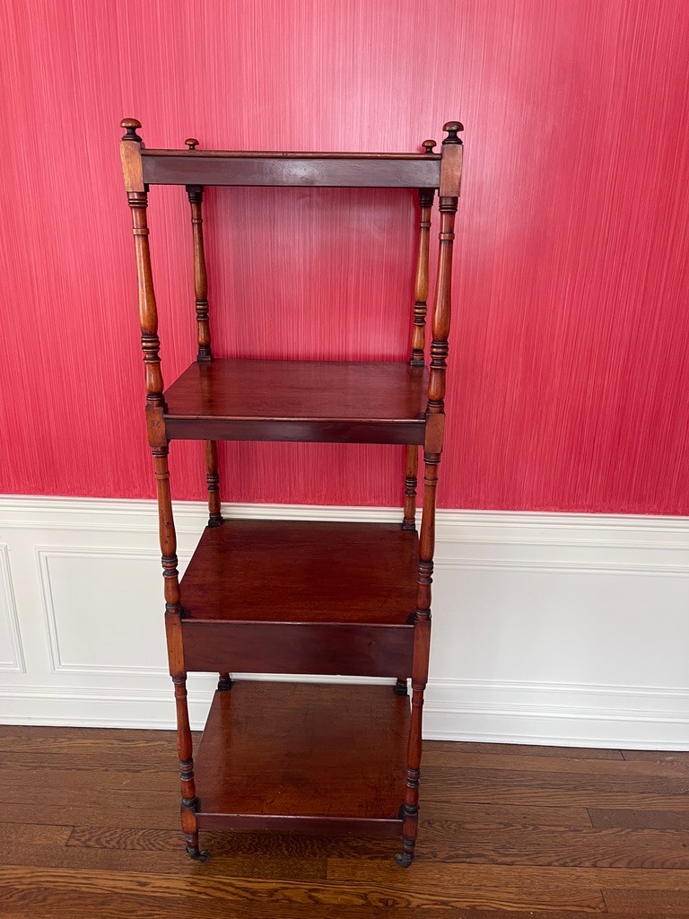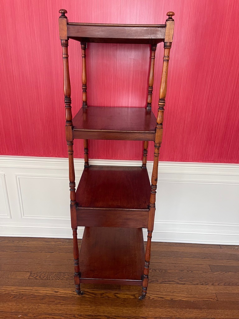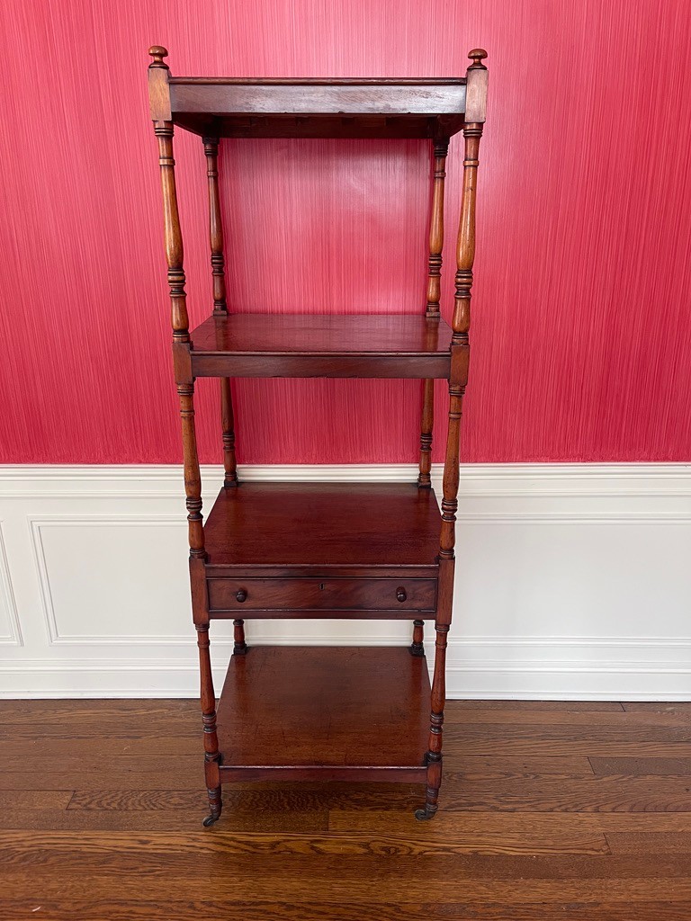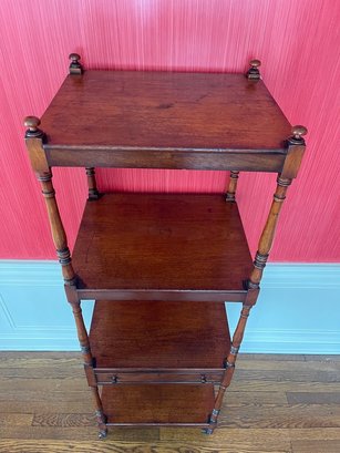 Solid mahogany supported by slender turned columns with finials on top and single drawer on third tier. Historically used as a versatile piece for displaying various items or plants. Would make a great bar.