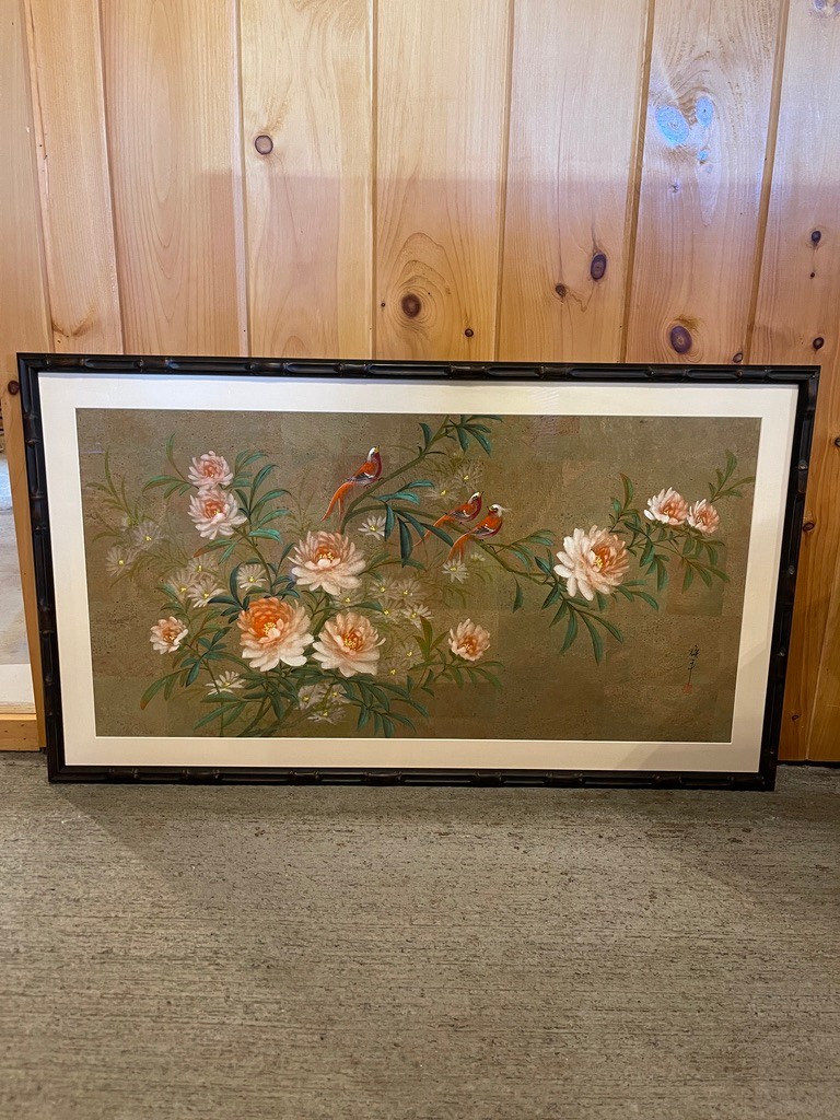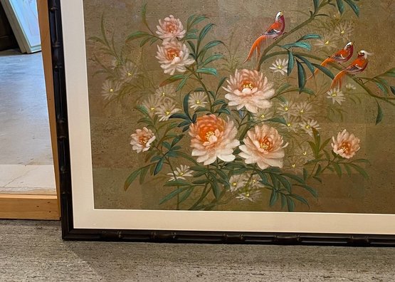 Elegant and serene, this framed artwork features a delicate composition of blooming peonies and perched songbirds rendered in a traditional Asian-inspired style. Soft, natural tones are accented with subtle pops of pink, green, and red, creating a balanced and tranquil scene that brings a sense of refinement to any space.