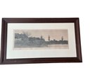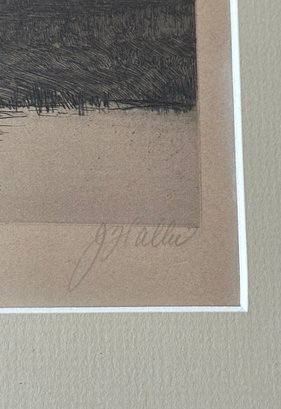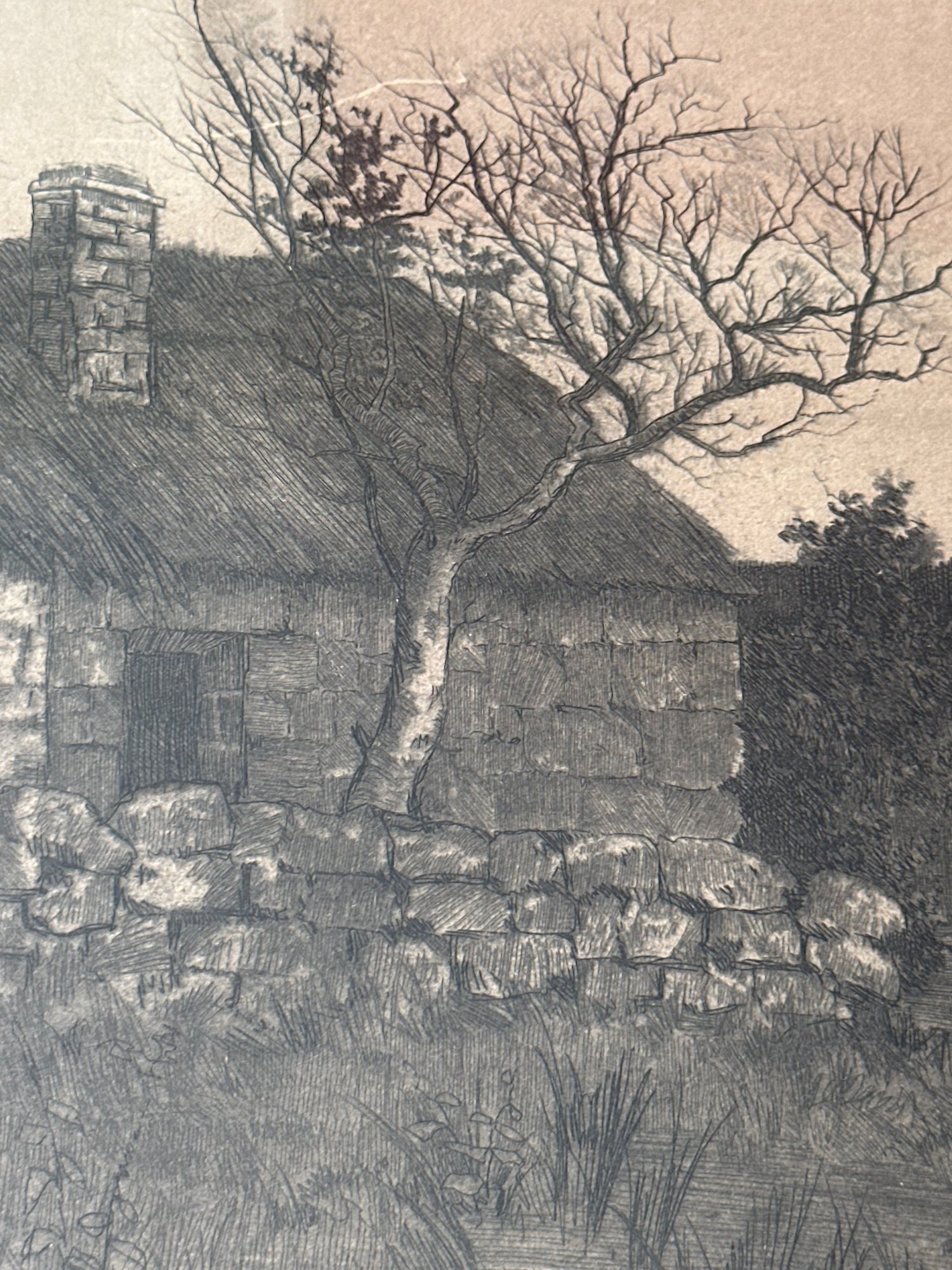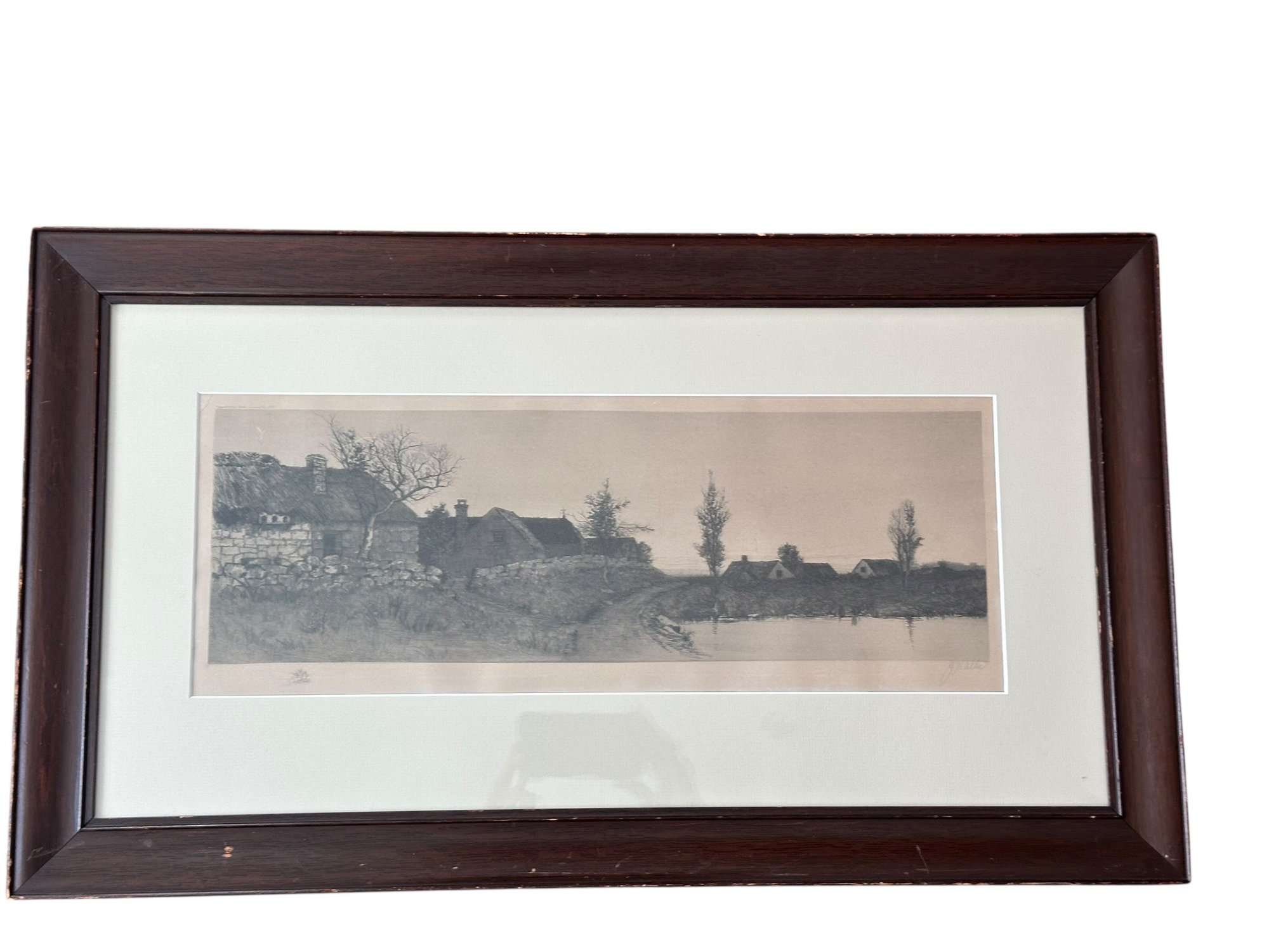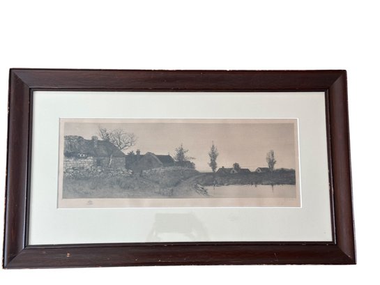 Elegant framed landscape etching depicting a quiet rural scene with stone cottages, trees, and a reflective body of water in the foreground. The composition captures a tranquil countryside setting, rendered in soft tonal gradations and fine linework typical of traditional etching techniques. The artwork is matted in a neutral tone and housed in a dark wood frame
