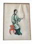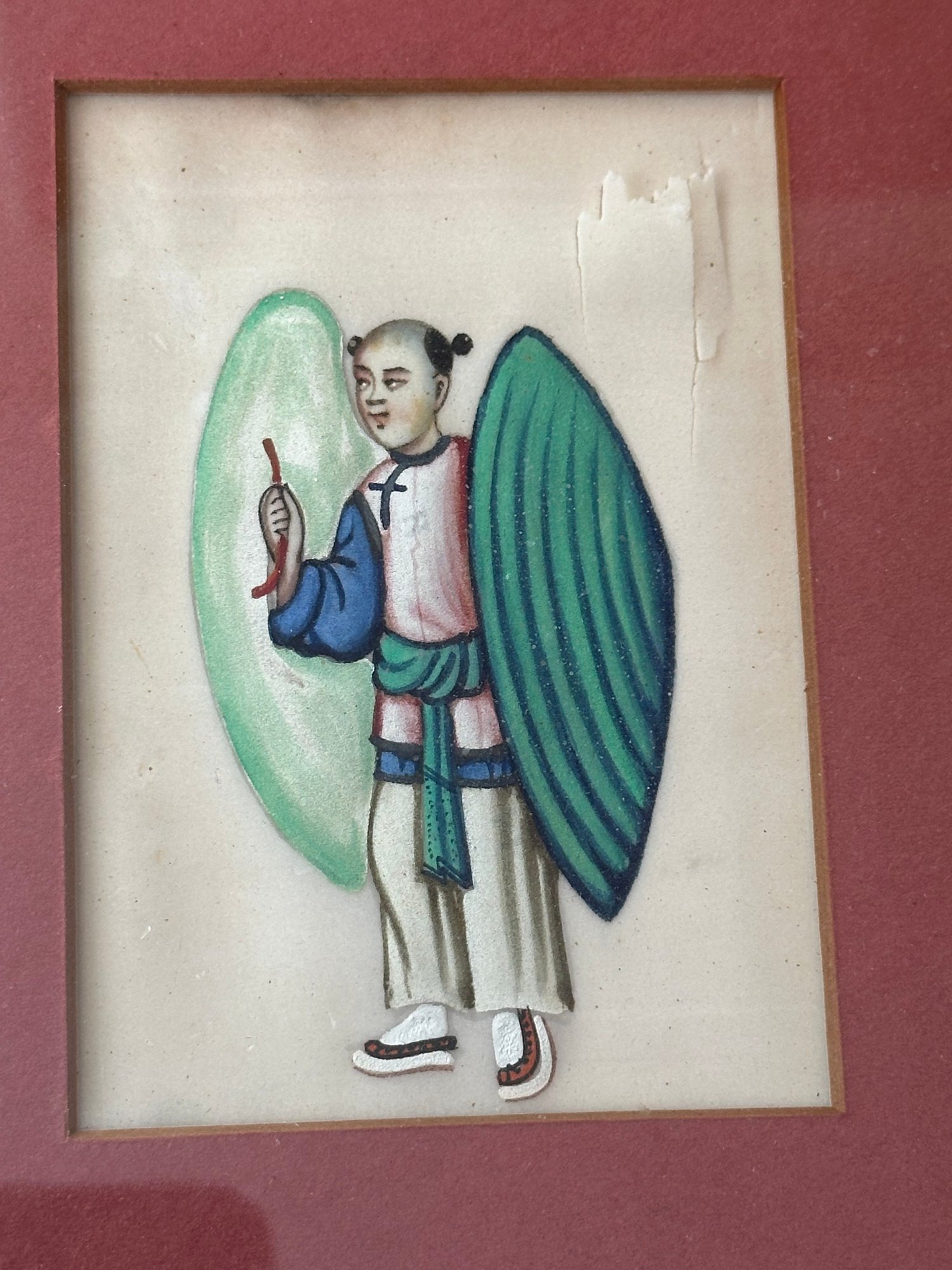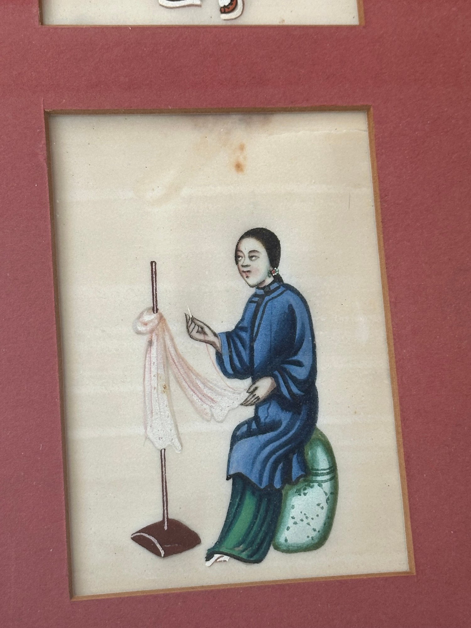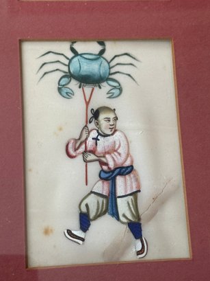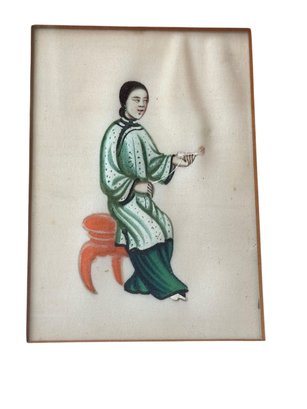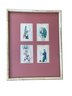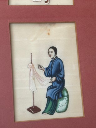 Decorative framed grouping of four Chinese figural paintings, each delicately rendered on pith paper. The compositions depict traditionally dressed figures engaged in various activities, executed in soft yet vibrant hues of green, blue, pink, and coral. Each miniature painting is individually matted within a rose-colored ground and housed together in a faux bamboo-style frame, complementing the Asian aesthetic. The fine detailing and translucent quality of the pith paper are characteristic of 19th-century Chinese export artwork produced for the Western market.