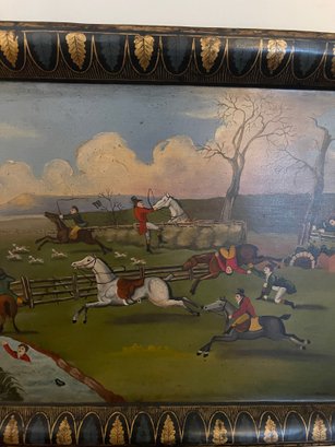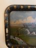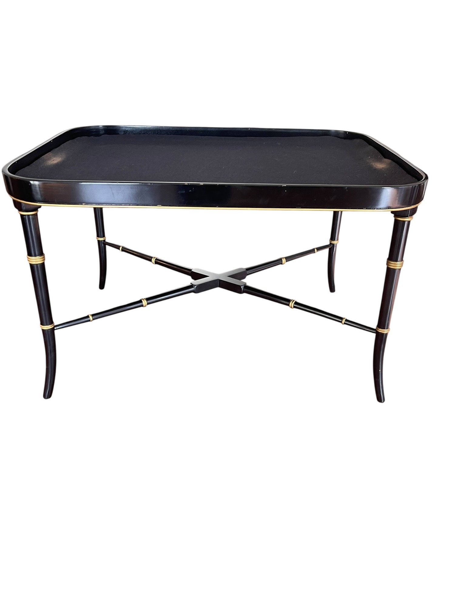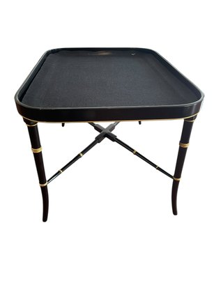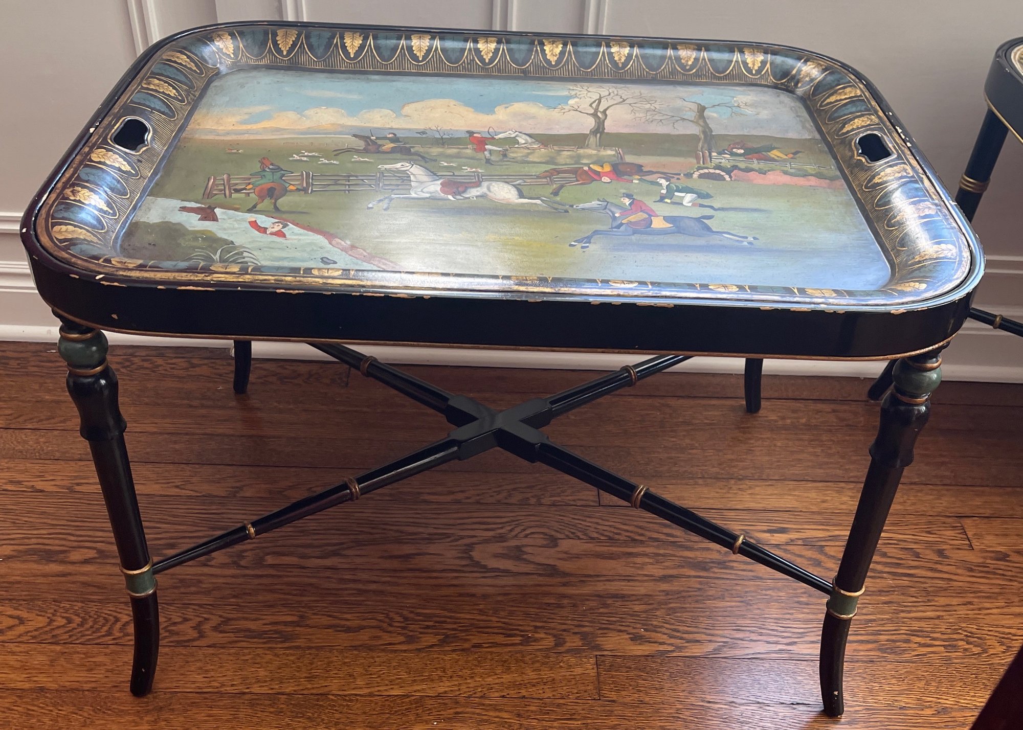 Hand painted English tole tray table with a custom lacquered black & gold stand. The tray can be removed for serving and entertaining, as a decorative tray or for use as a coffee table.