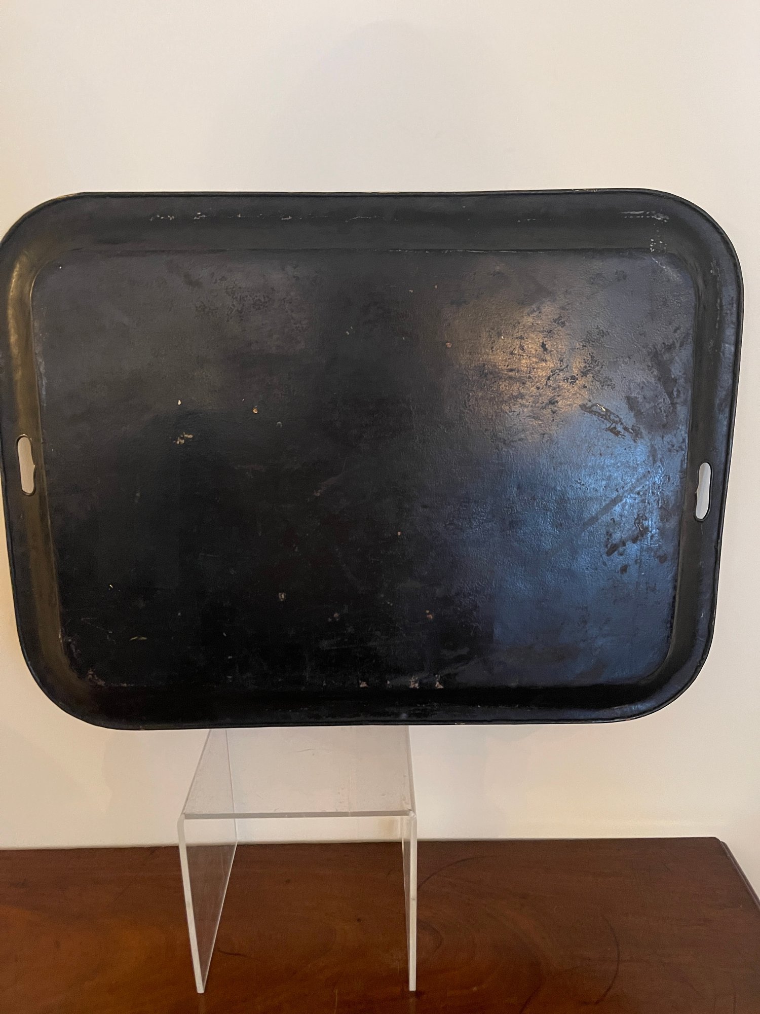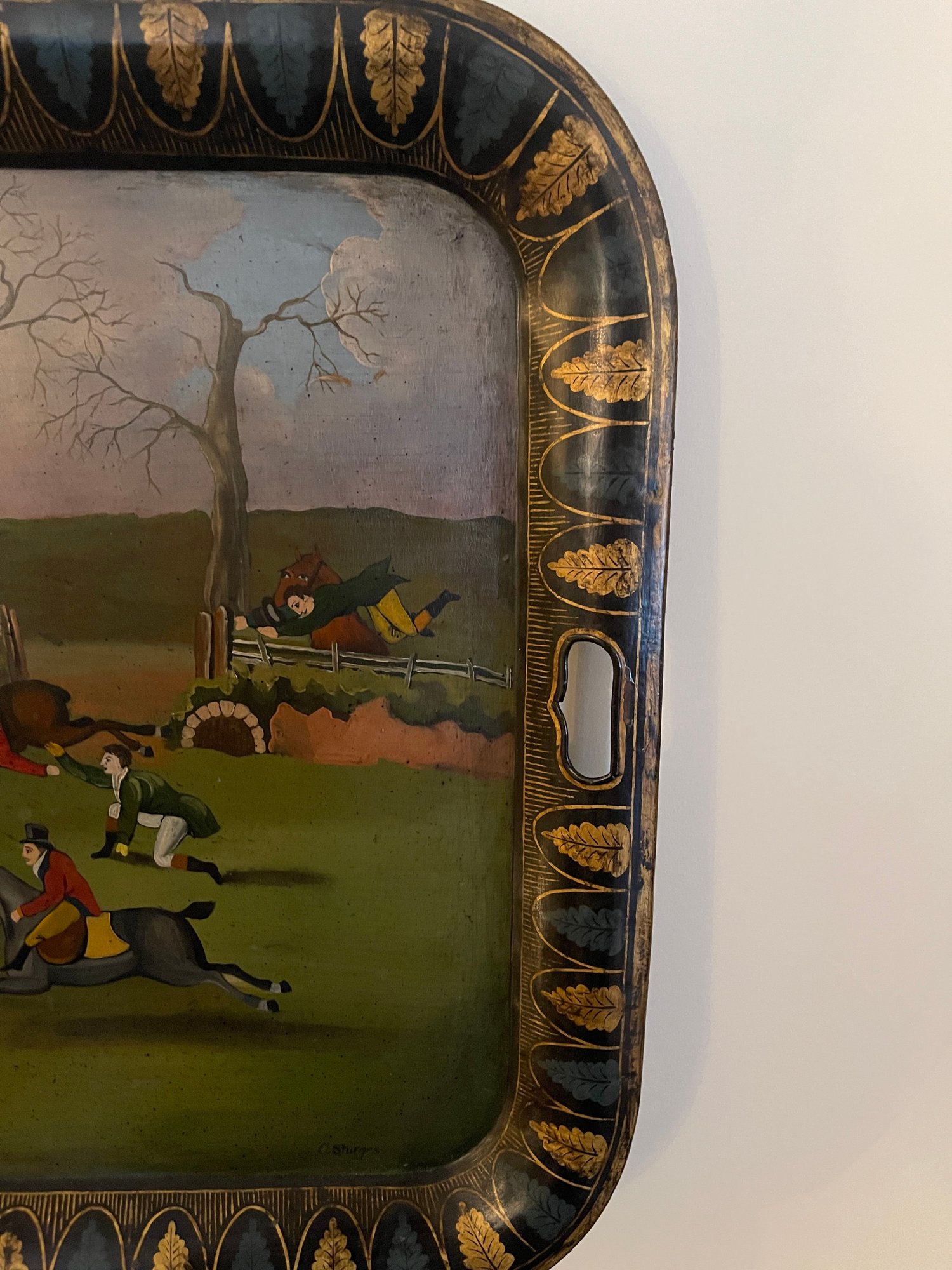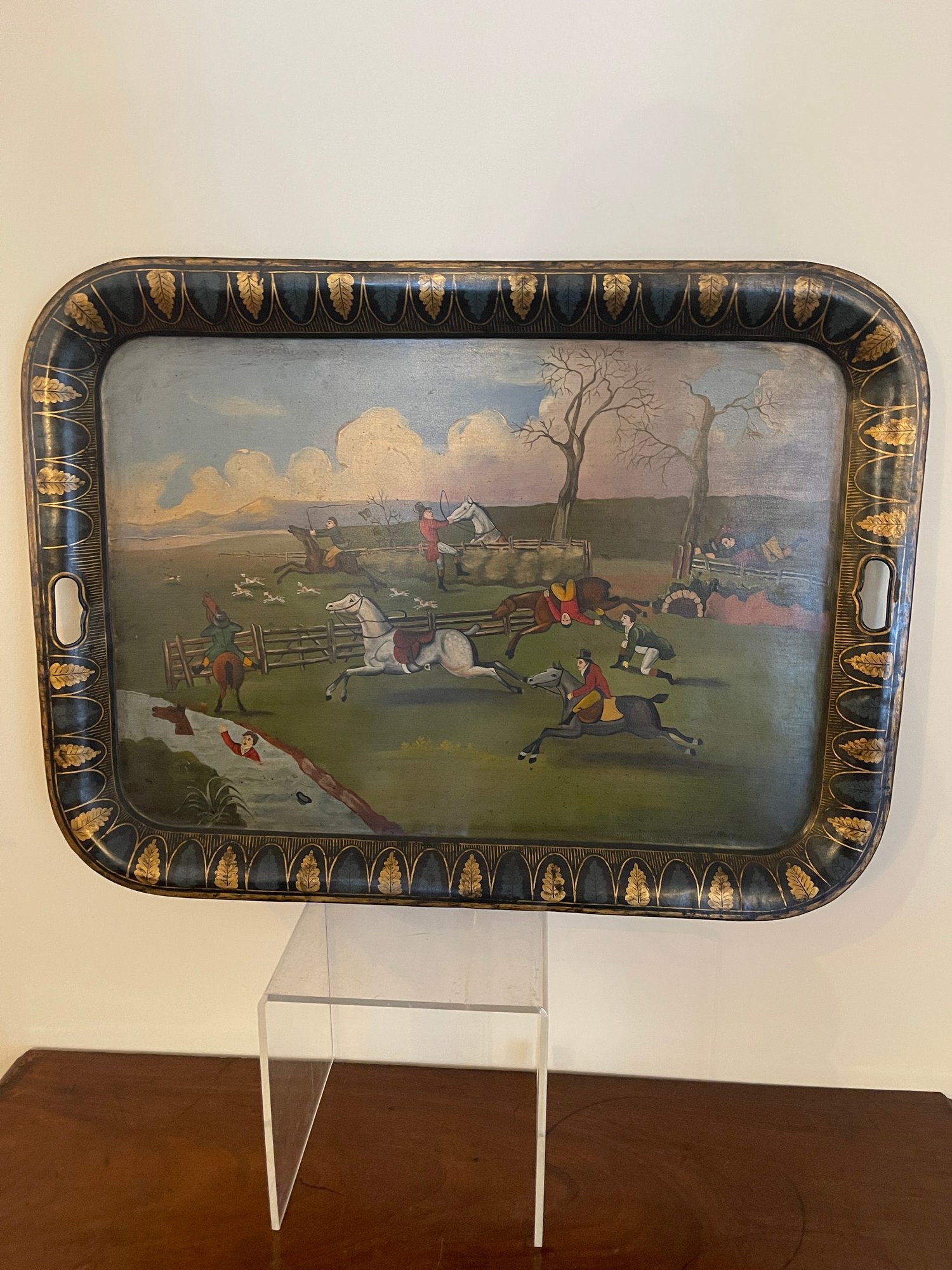 Hand painted English tole tray table with a custom lacquered black & gold stand. The tray can be removed for serving and entertaining, as a decorative tray or for use as a coffee table.