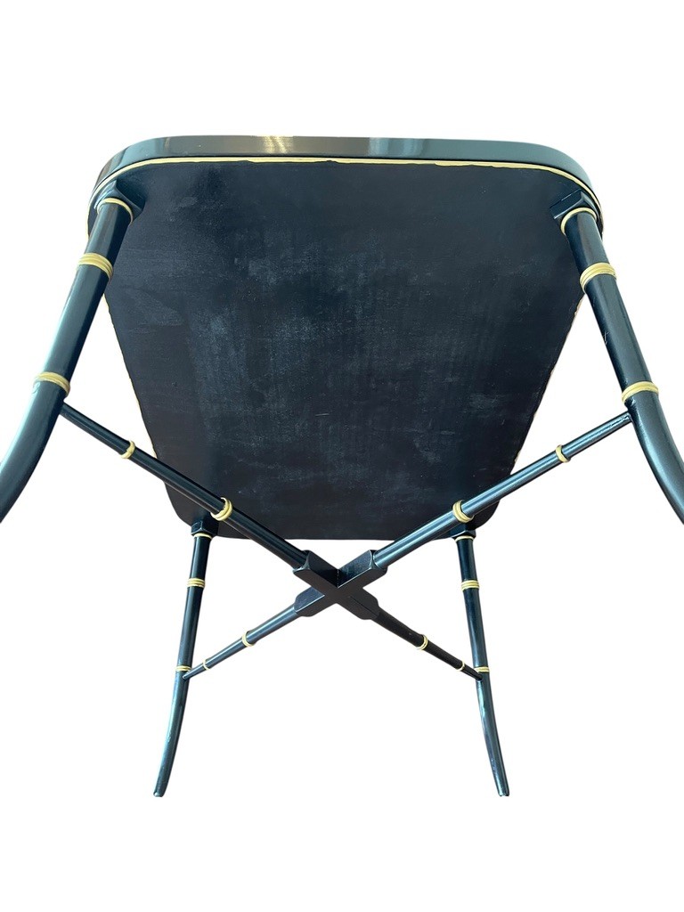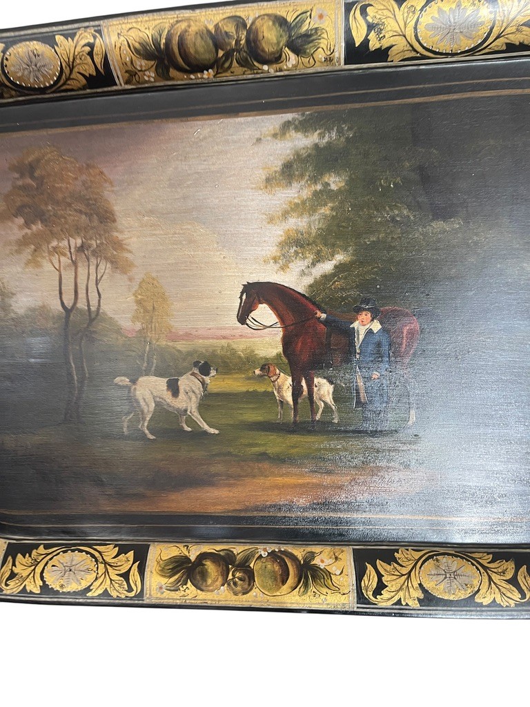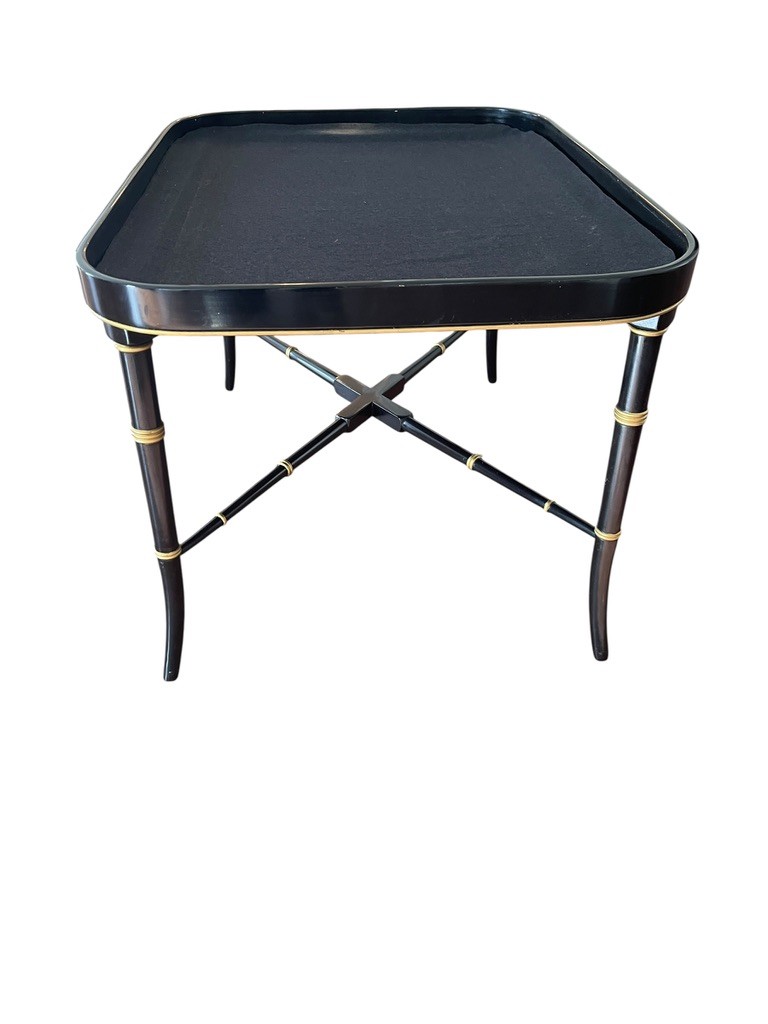Hand painted English tole tray table with a custom lacquered black & gold stand. The tray can be removed for serving and entertaining, as a decorative tray or for use as a coffee table.
