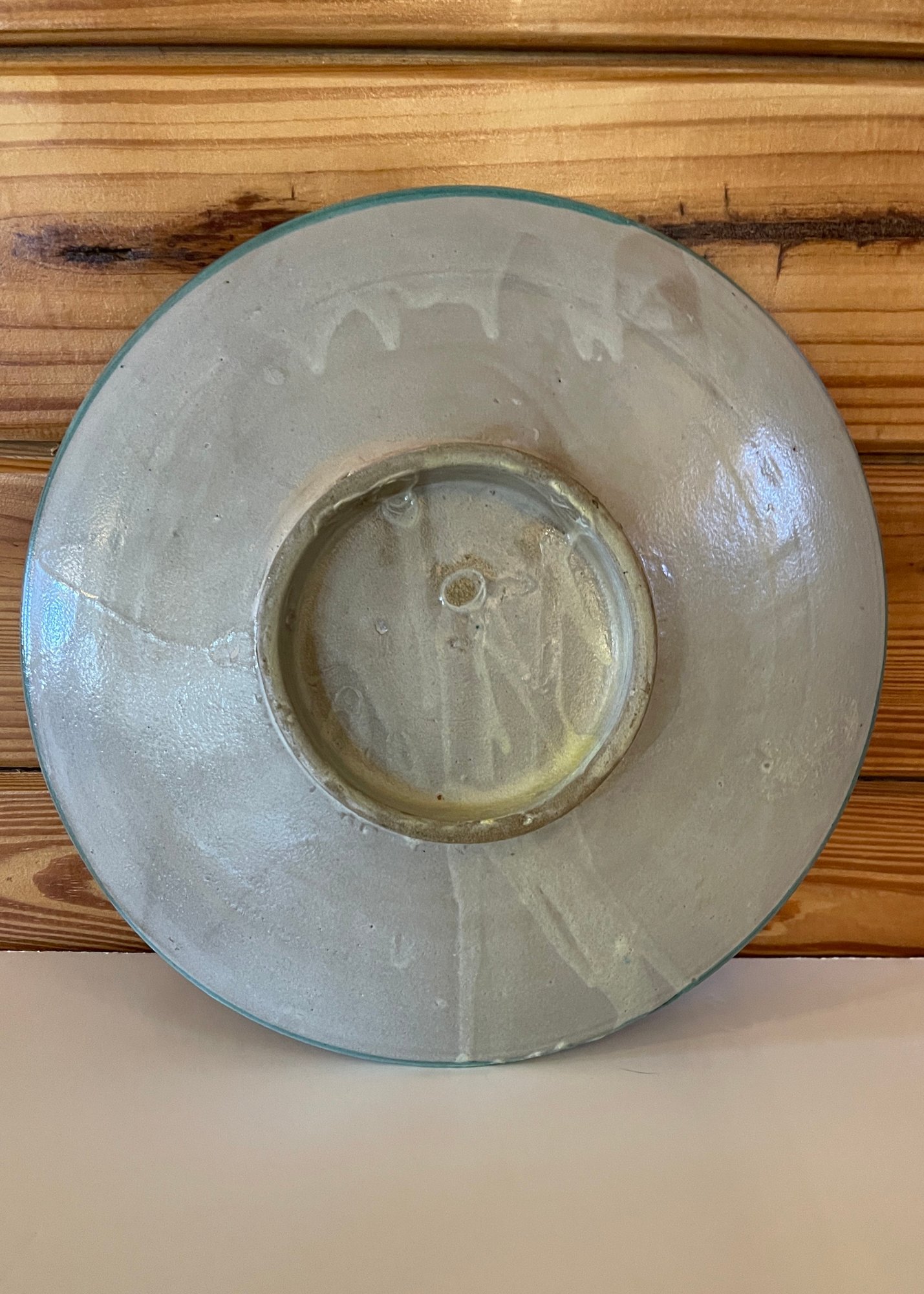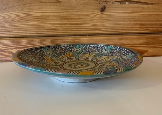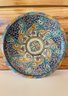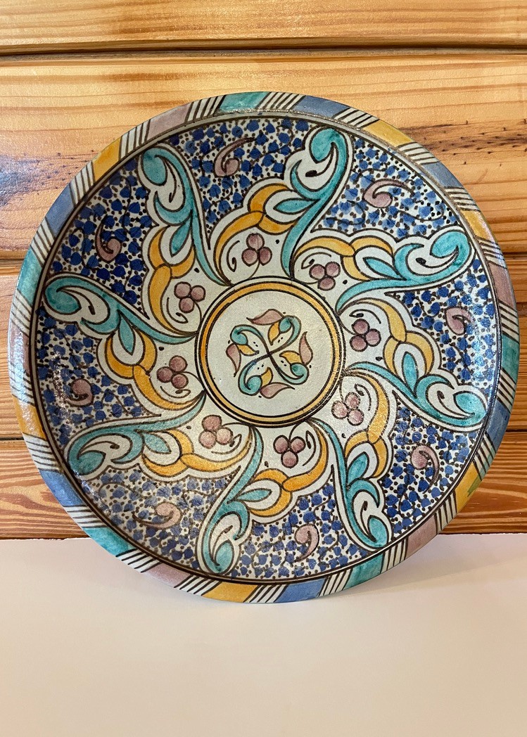 Beautiful hand-painted ceramic plate featuring an intricate Moroccan design with a central medallion surrounded by flowing floral and geometric motifs. The rich palette of teal, mustard, blue, and soft terracotta is set against a detailed dotted background, creating depth and visual texture.