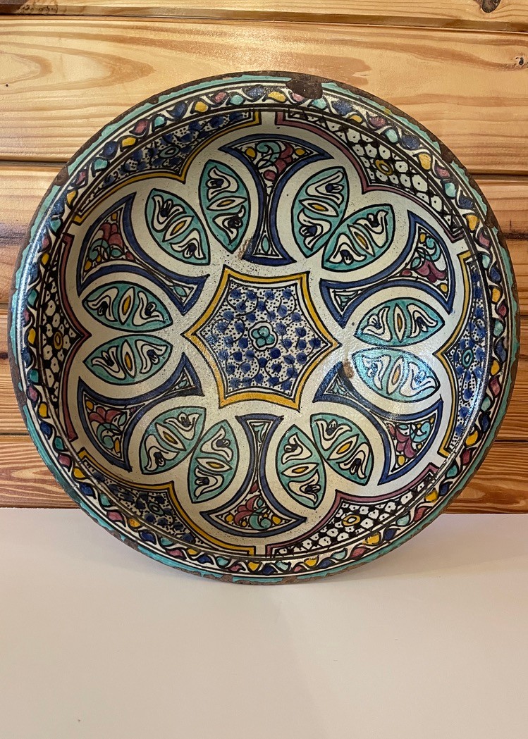 Vibrant hand-painted ceramic plate featuring an intricate Moroccan-inspired medallion design in a rich palette of teal, blue, mustard, terracotta, and black. The symmetrical pattern radiates from a central star motif, surrounded by repeating geometric and floral elements that create depth and visual movement.