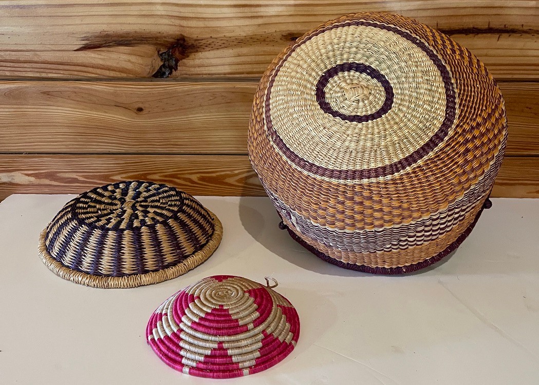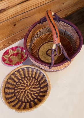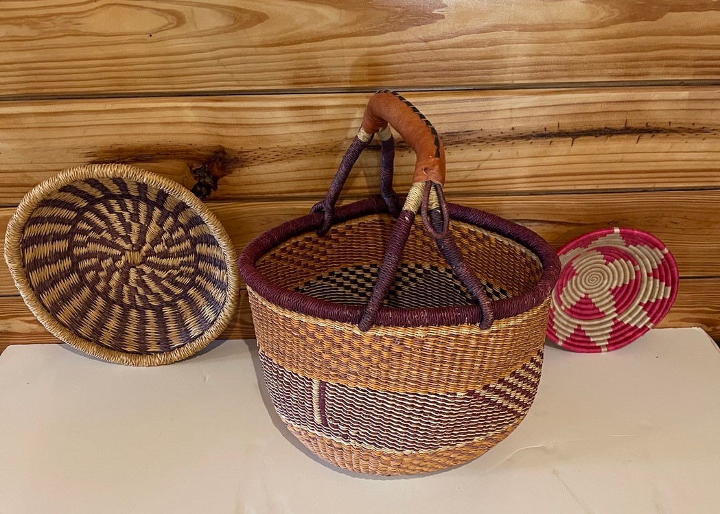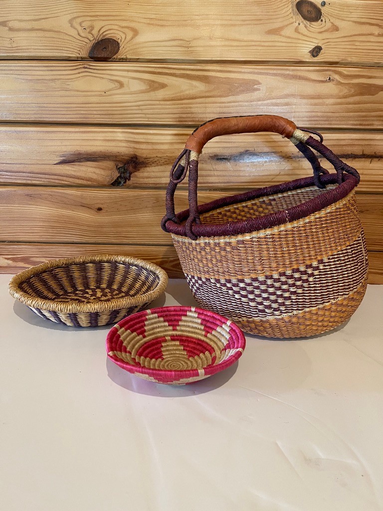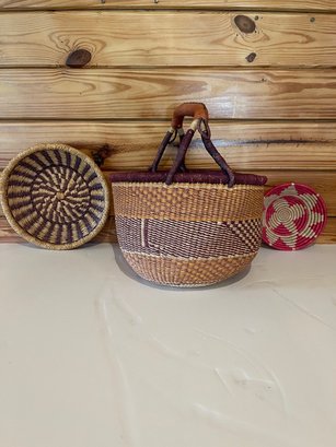 Beautiful handwoven African market basket featuring rich natural tones with burgundy and tan patterning. Crafted from natural fibers, this sturdy basket includes wrapped handles and a leather grip for comfortable carrying, making it both functional and decorative.