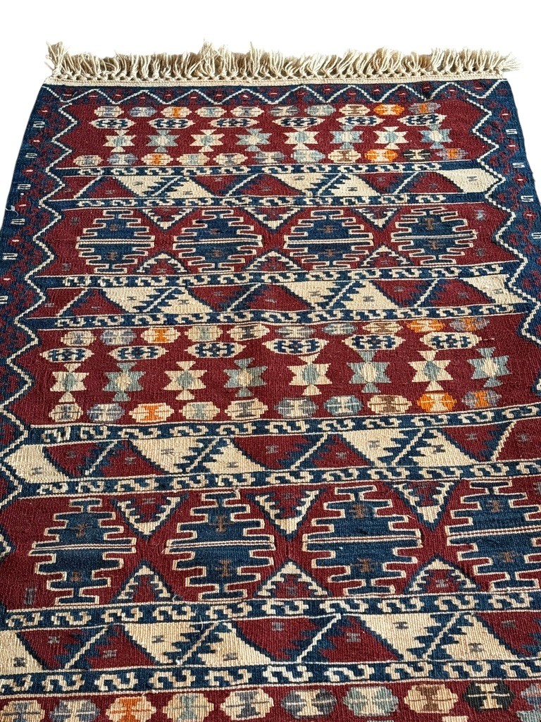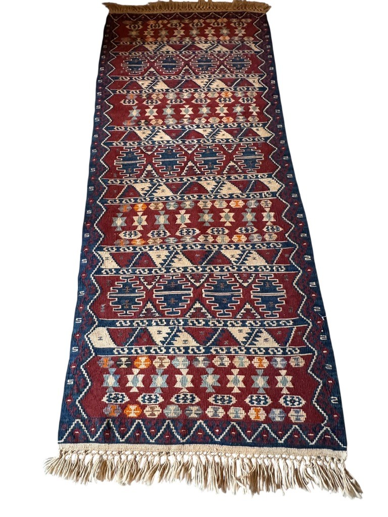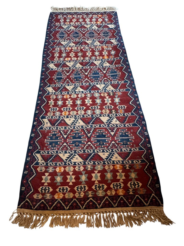 A striking handwoven wool runner rug featuring bold geometric motifs in deep red, navy, ivory, and soft earth tones. Finished with hand-tied fringe at both ends, the rug has a rich, saturated palette and a slightly irregular weave that reflects its handmade character. A versatile piece ideal for hallways, entryways, or layered in eclectic and traditional interiors.