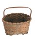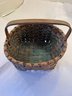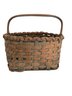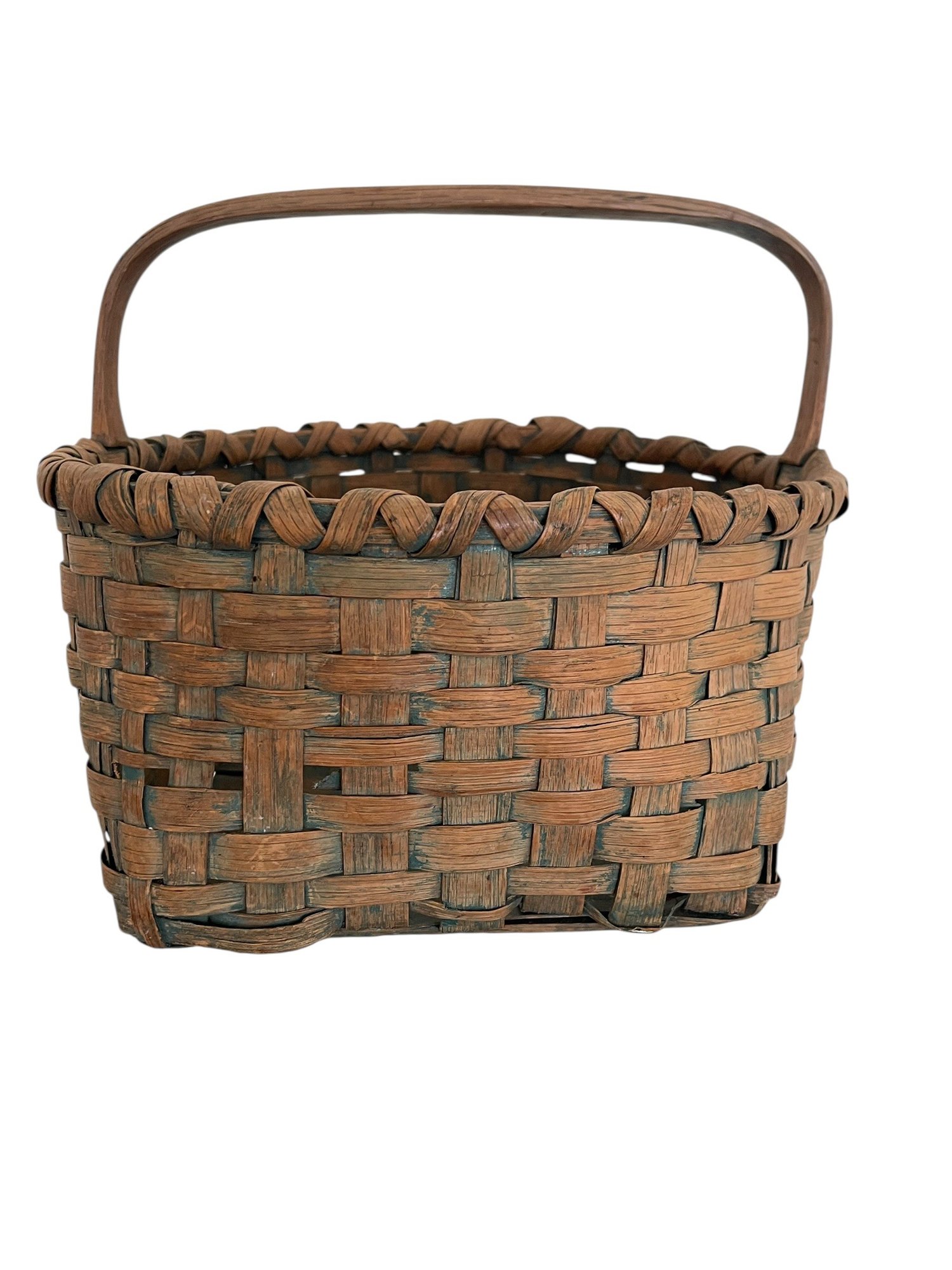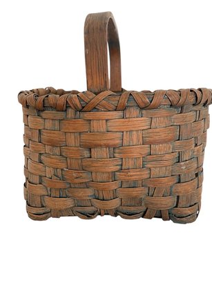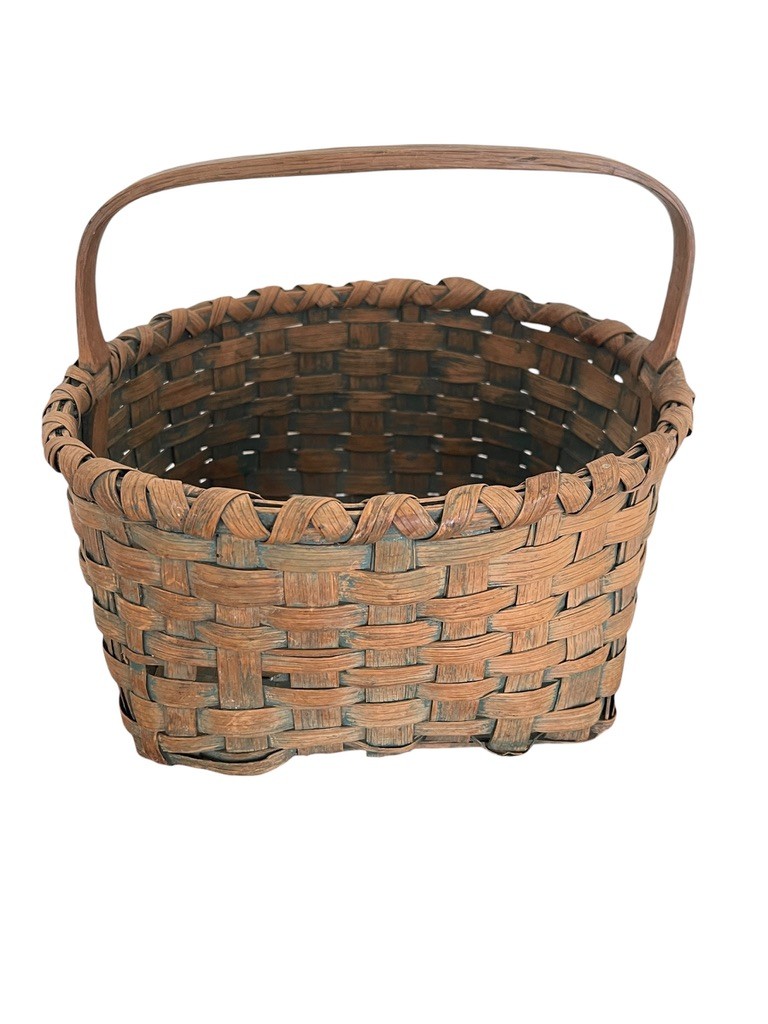 Charming handwoven wooden basket crafted in a traditional over-under weave pattern. The basket features sturdy, flat wooden splints and a solid bentwood handle securely attached at the rim, reflecting classic American country craftsmanship. The warm, natural patina highlights the grain and age of the wood, giving the piece wonderful character and authenticity. Ideal for use as a gathering basket, storage accent, or farmhouse display piece.