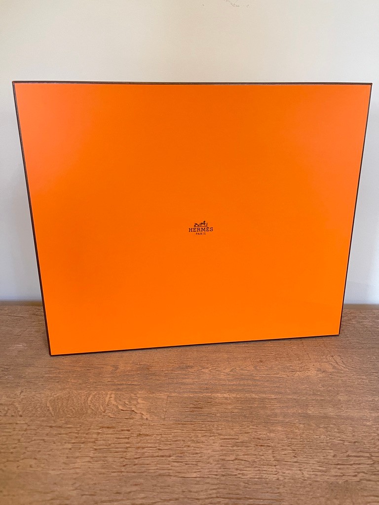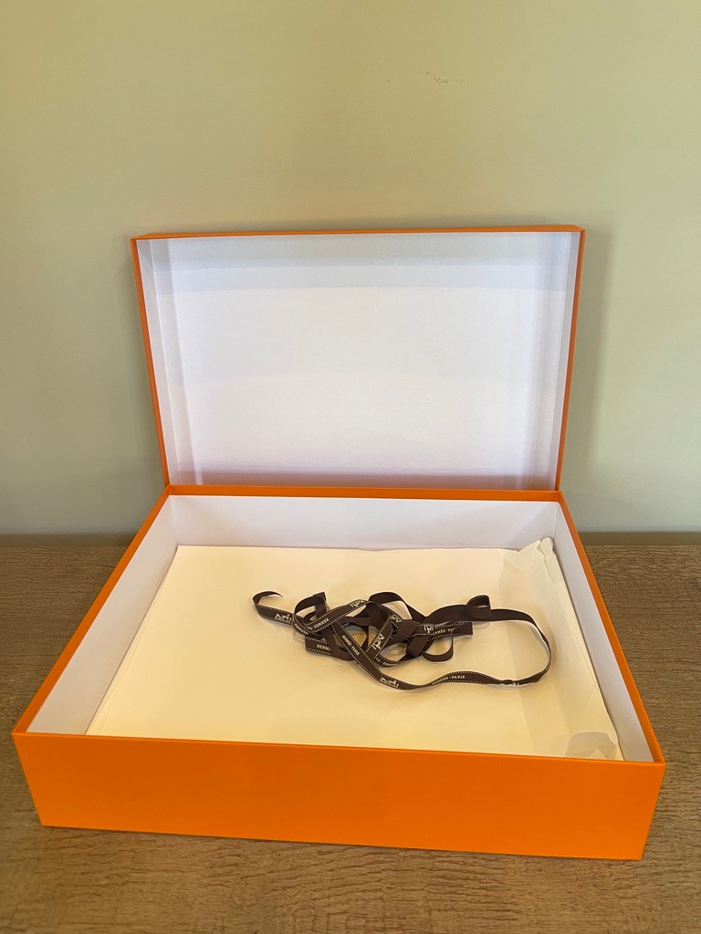Included is the original Hermès brown ribbon, adding to its authenticity and luxury appeal. Boxes of this size are typically reserved for larger Hermès items and are highly sought after for both practical use and decorative purposes.