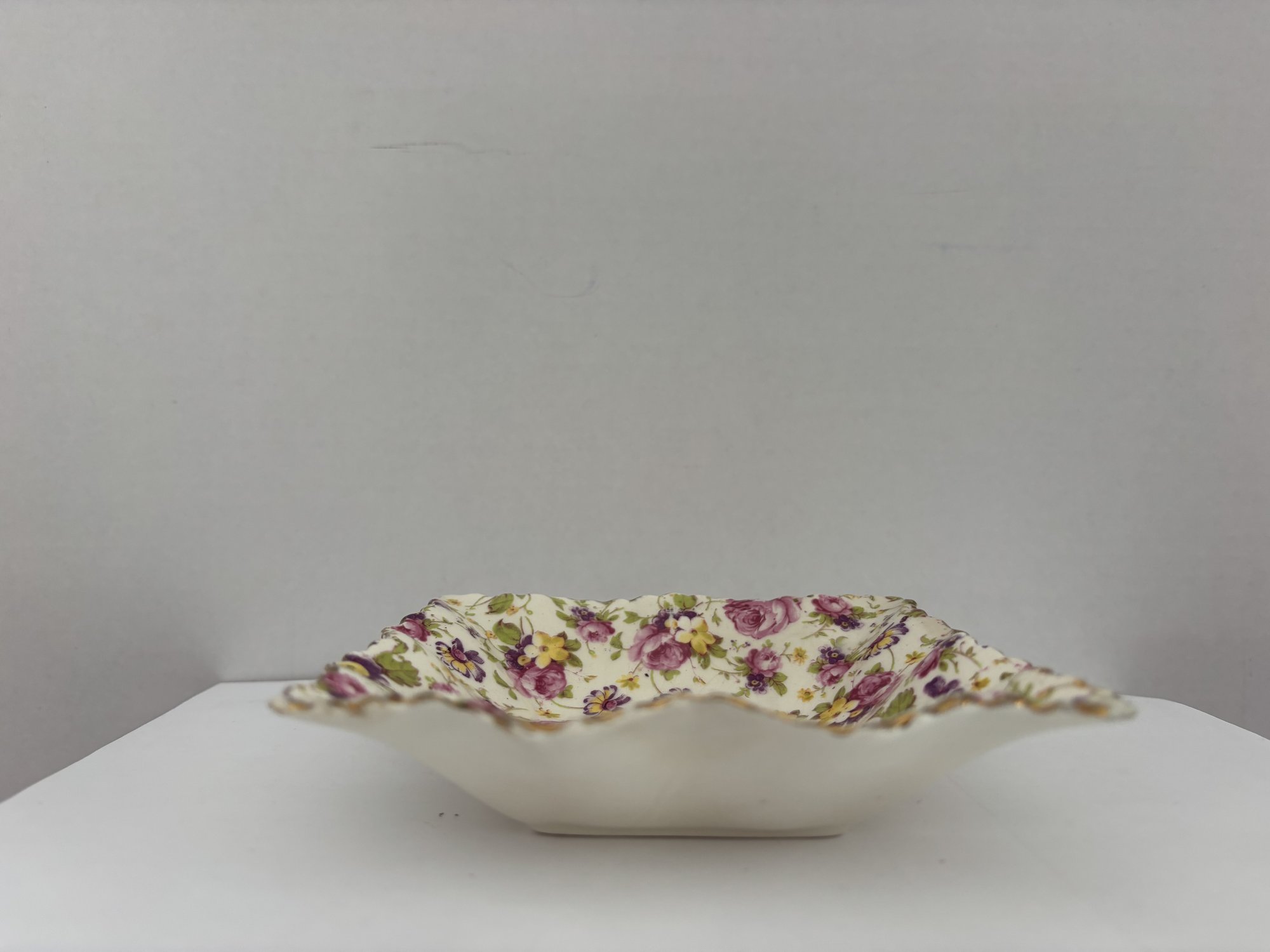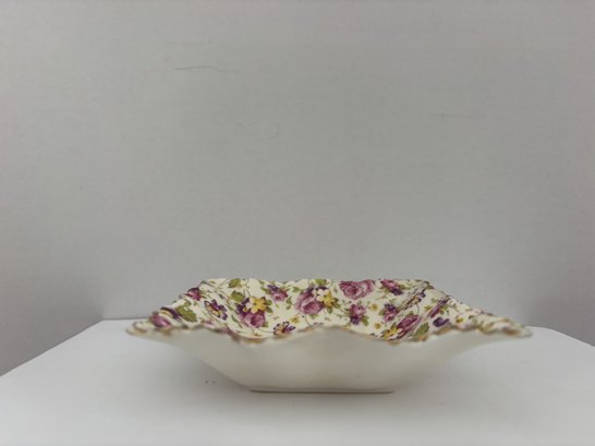 Vintage James Kent, Ltd. "Rapture" chintz scalloped bowl from Staffordshire England. The dish features a colorful floral chintz design with pink, purple and yellow flower. It has ruffled or scalloped edges.