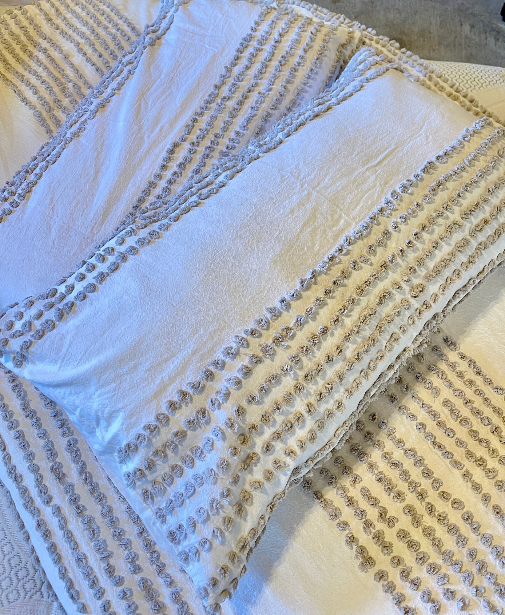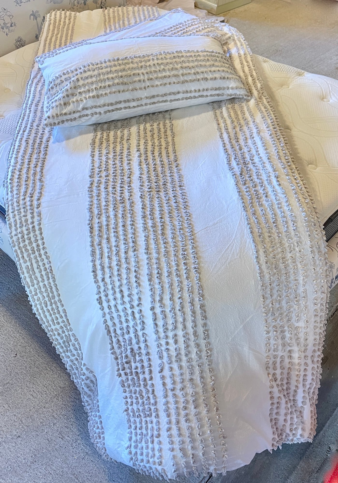 A stylish King Comforter and two king pillows with shams in a soft, neutral palette, perfect for adding texture and warmth to any living space. This set features a raised woven stripe design in subtle gray tones against a crisp ivory background, offering a clean, modern yet cozy aesthetic.