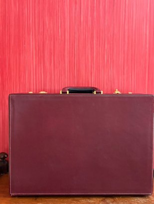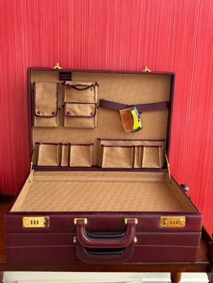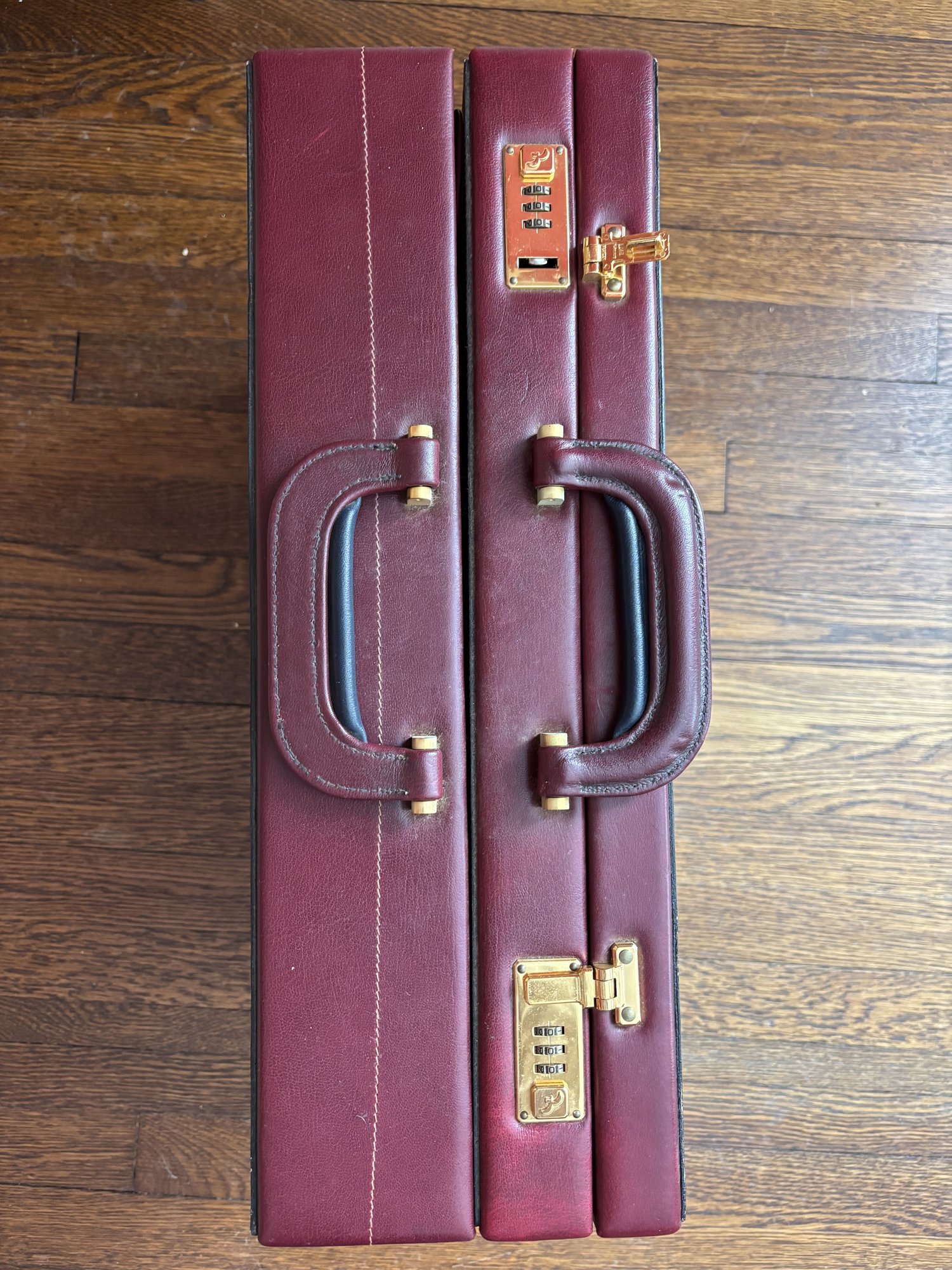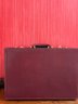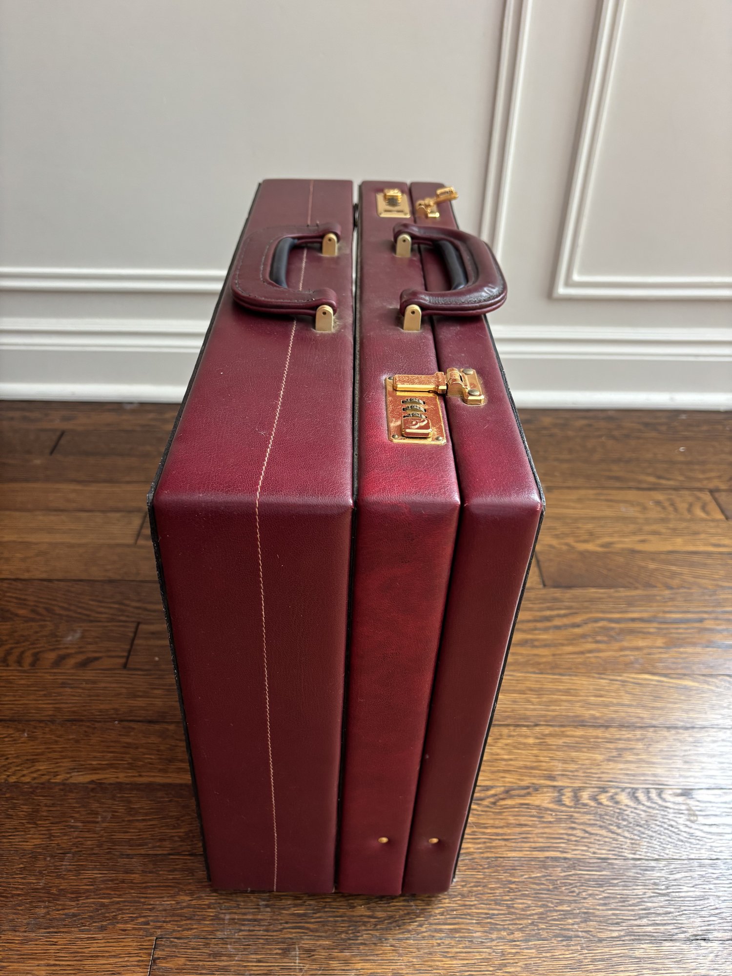 Burgundy leather attache briefcase that comes apart. The briefcase detaches and can be made smaller for easy transport. The tag lists 2000 Secret Service