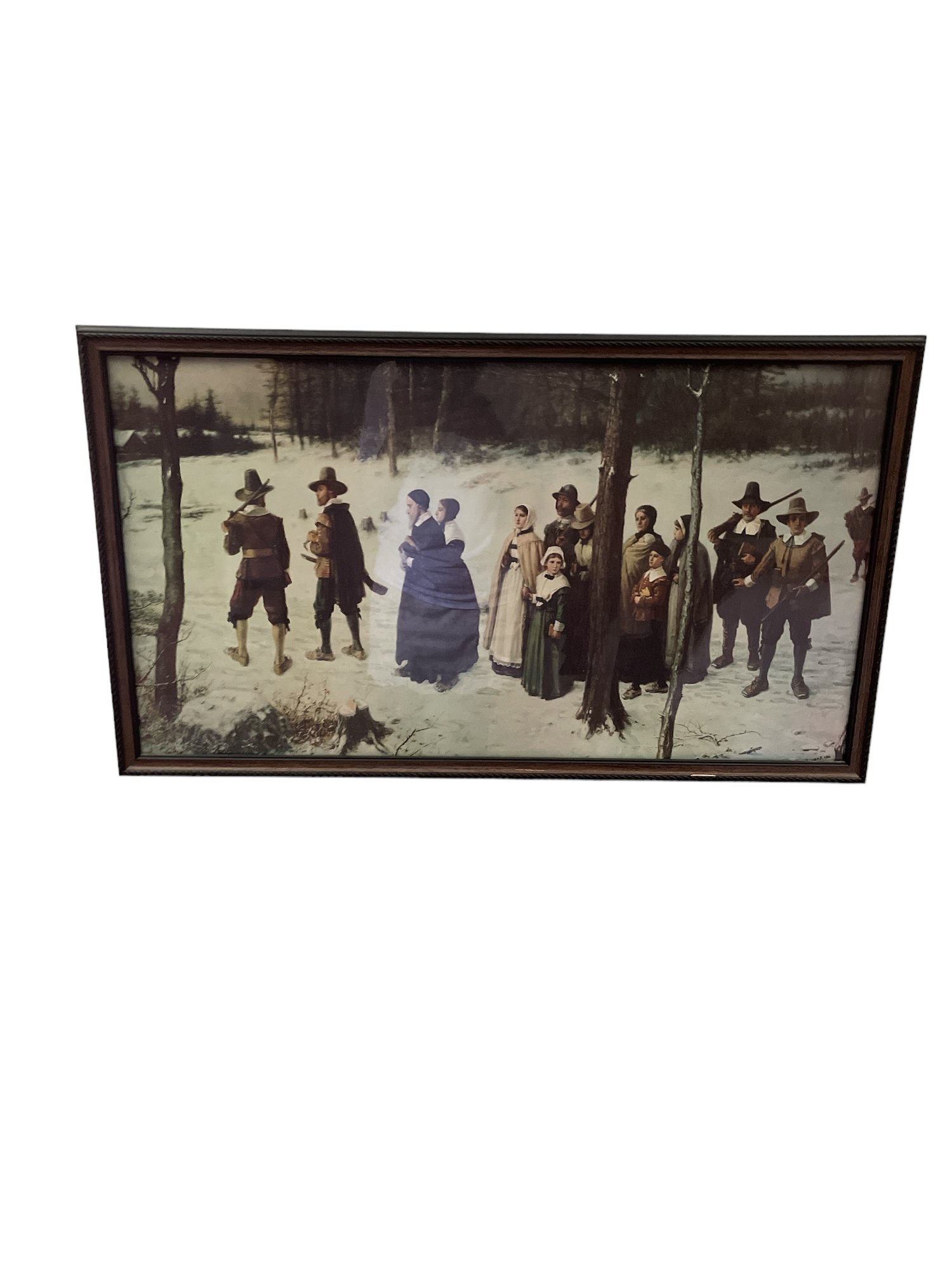 Print of Pilgrims Going To Church (1867) originally The Early Puritans of New England Going to Church, influenced by a painting by Anglo-American painter George Henry Boughton (1833–1905).