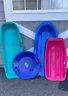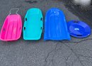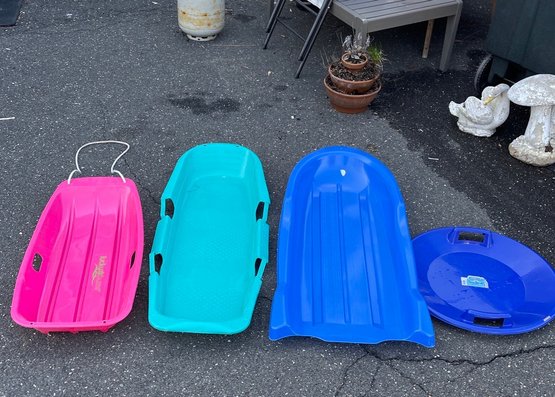Miscellaneous size and styles of snow sleds.