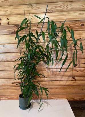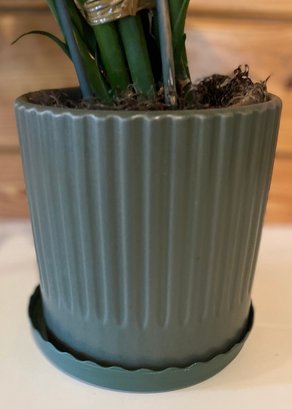 Lush and vibrant lucky bamboo plant featuring multiple stalks with cascading green foliage. Arranged in a clean, modern ribbed planter, this piece brings a fresh, natural element to any space.