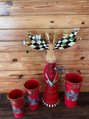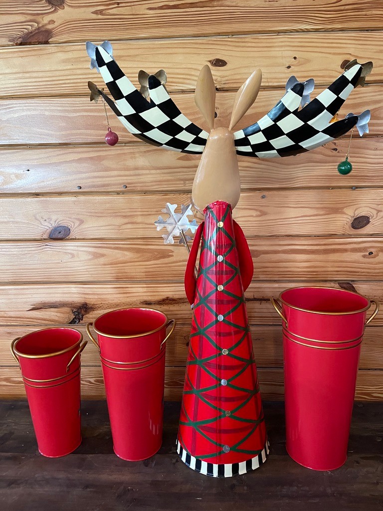 The three metal buckets feature holly and check motif detailing with brass-tone handles and labels, perfectly complementing the playful and collectible Mackenzie-Childs aesthetic. Largest bucket 15" Moose 33"h x 9"w, ears 22" across