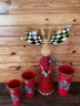 Whimsical and eye-catching holiday décor set featuring a tall Mackenzie-Childs moose figure paired with three coordinating red metal buckets. The moose is dressed in a festive red and green patterned coat with signature black-and-white check accents on the antlers, adorned with dangling ornaments for added charm.