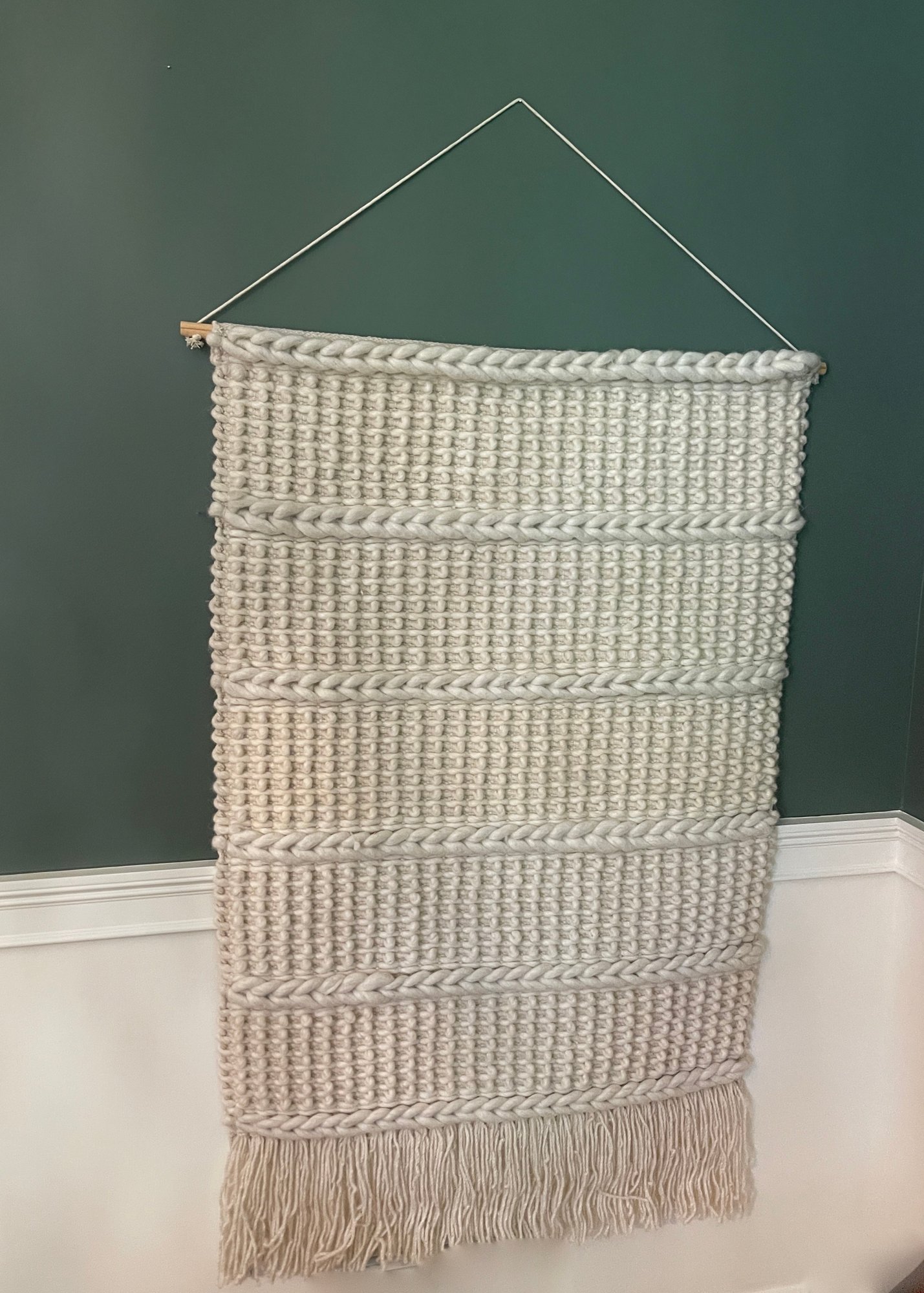 A decorative macrame wall hanging using knot-tying technique made of natural fiber yarn and offers a dowel for displaying.