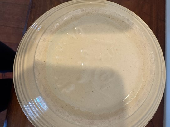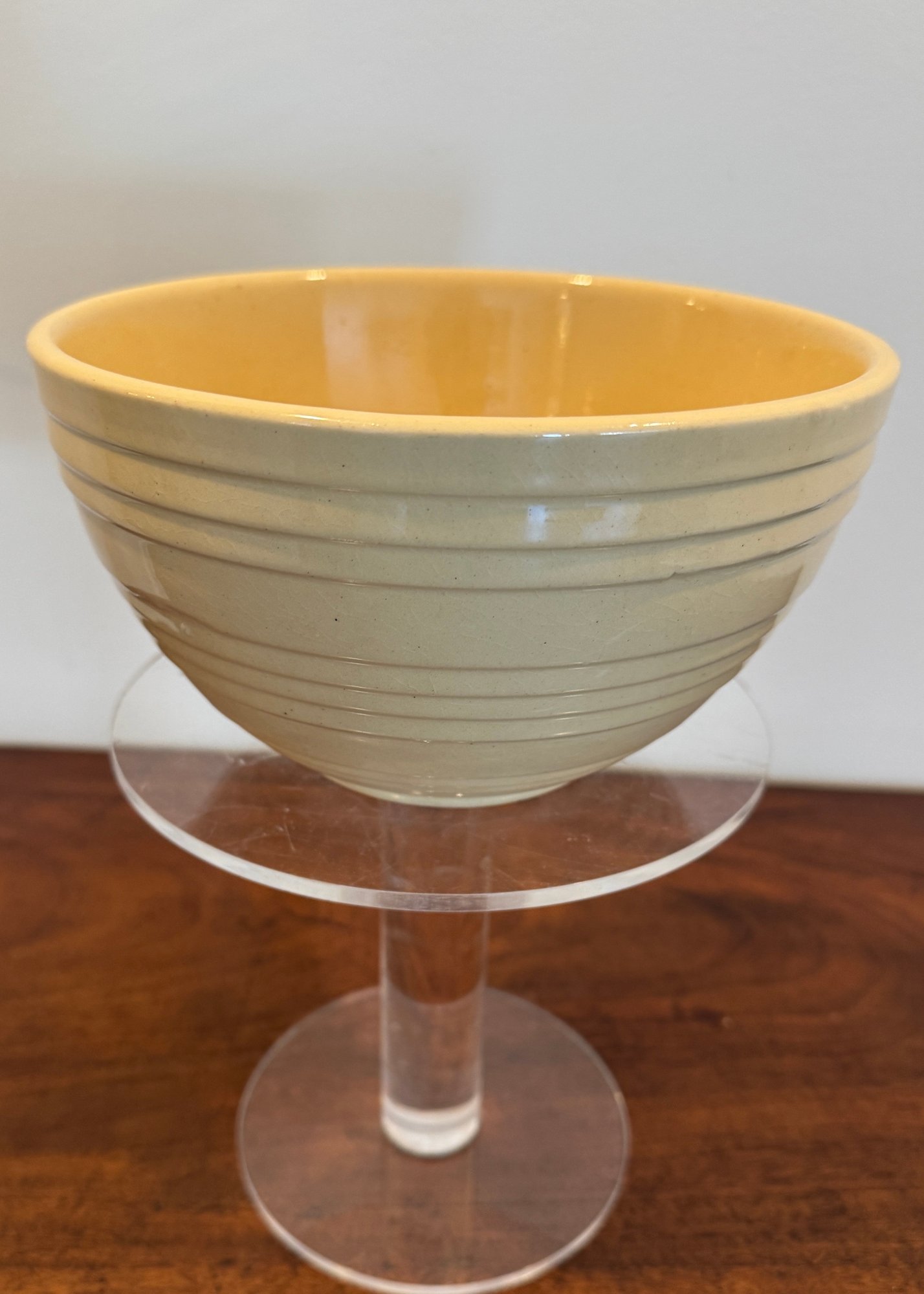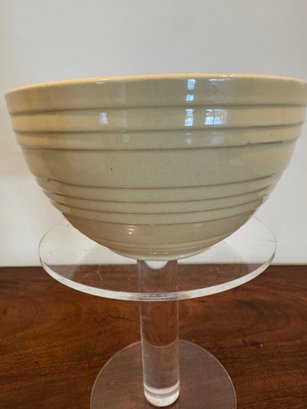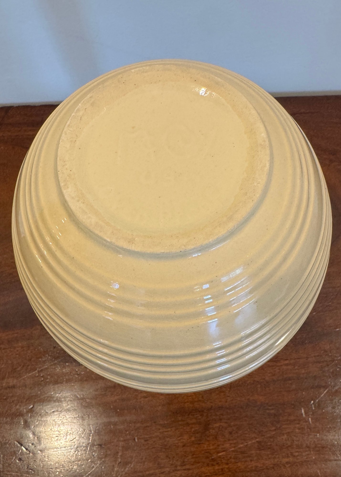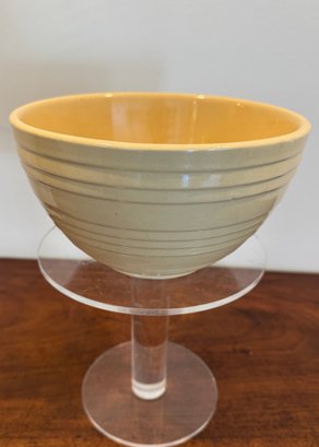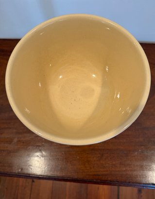 Classic vintage McCoy mixing bowl featuring a soft cream-colored glaze with a warm golden interior. The exterior is accented with concentric ribbed bands that taper gracefully toward the base. The smooth, glossy glaze and sturdy construction reflect mid-century kitchenware design, making this piece both functional and decorative. Its neutral tone allows it to blend beautifully into farmhouse, cottage, or traditional kitchen settings.