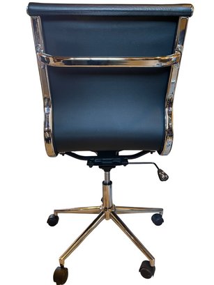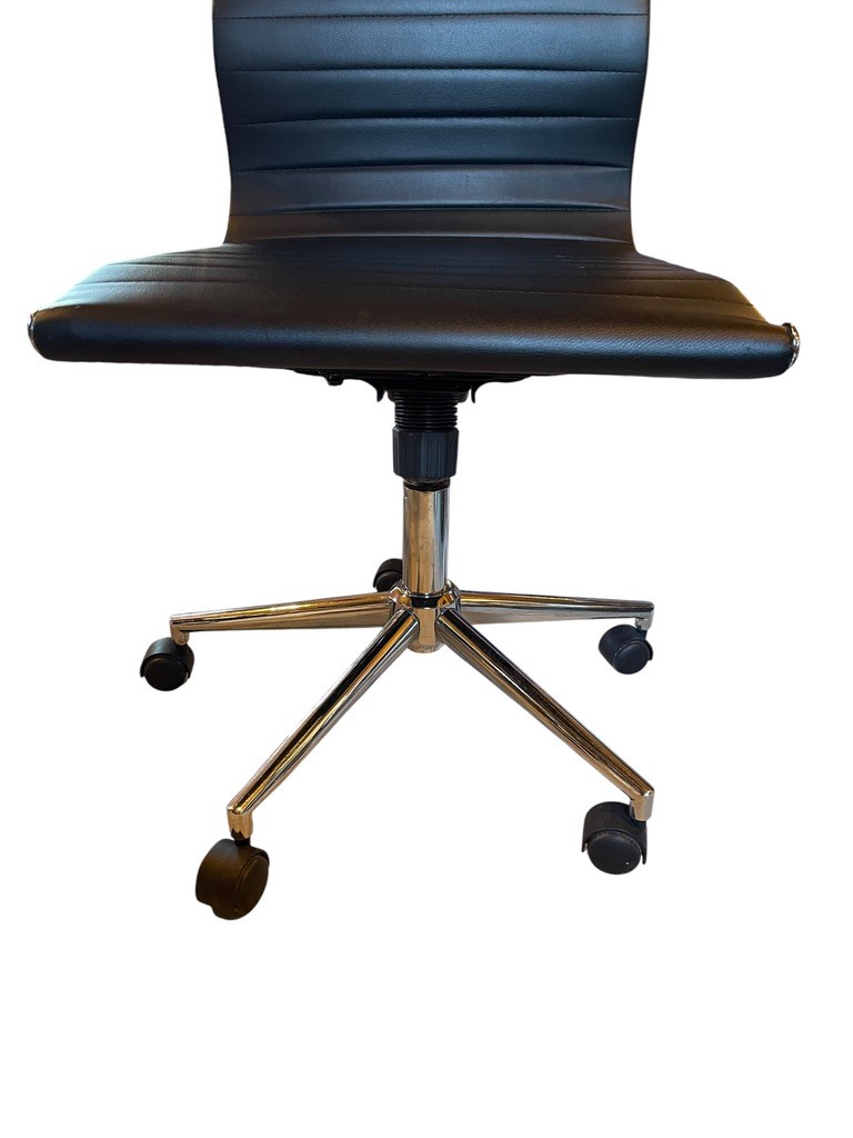 Sleek and contemporary office chair featuring black faux leather upholstery with horizontal channel tufting. Designed with a gently contoured back and seat for comfort, this chair offers a clean, minimalist profile suitable for a home office, workspace, or vanity.