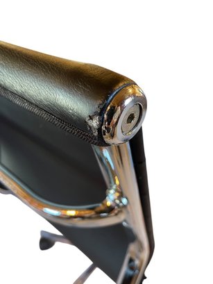 The polished chrome base includes five casters for smooth mobility, along with adjustable height functionality to accommodate various desk heights. Measurement is for seat. Chair height is adjustable. Two more available in this auction.