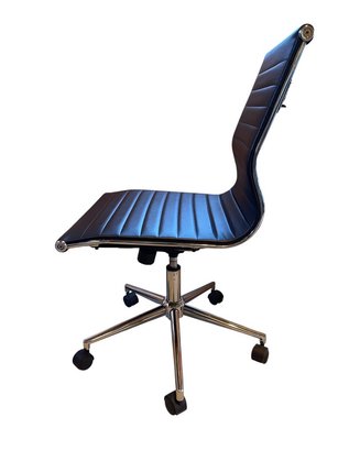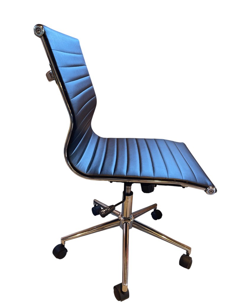 Sleek and contemporary office chair featuring black faux leather upholstery with horizontal channel tufting. Designed with a gently contoured back and seat for comfort, this chair offers a clean, minimalist profile suitable for a home office, workspace, or vanity.