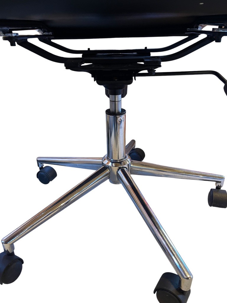 The polished chrome base includes five casters for smooth mobility, along with adjustable height functionality to accommodate various desk heights. Measurement is for seat. Chair height is adjustable. Two more available in this auction.