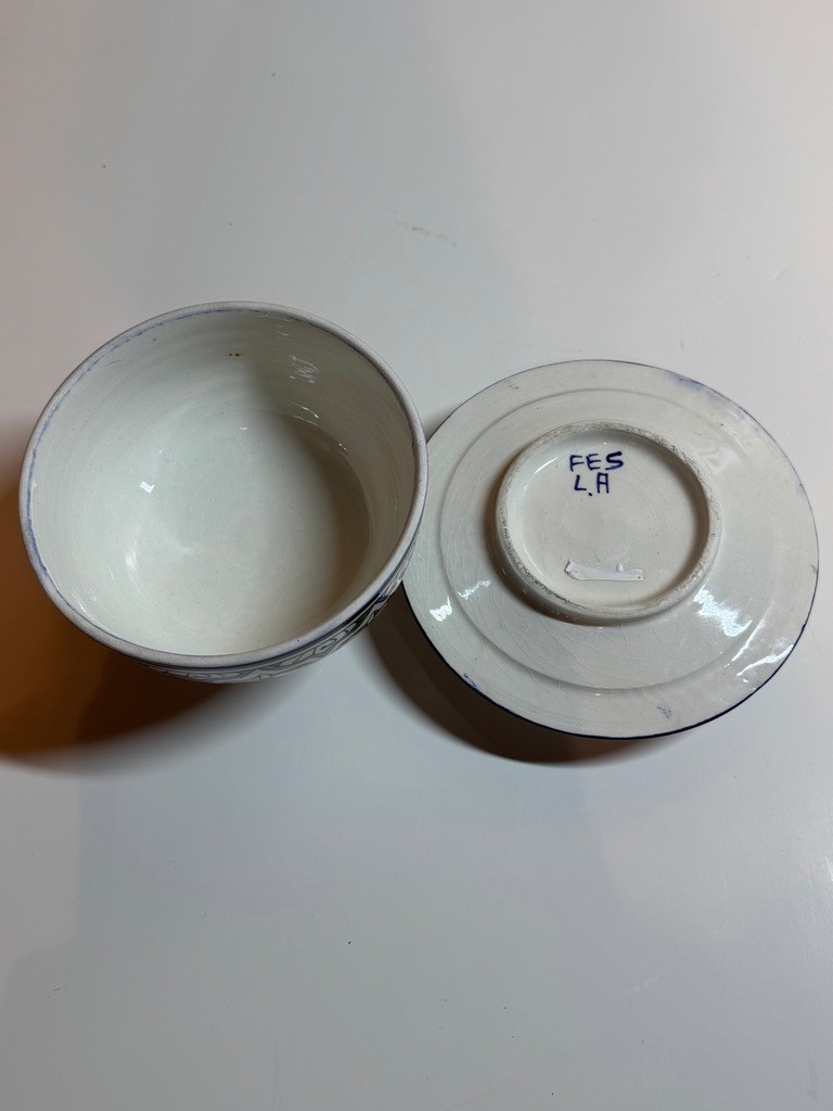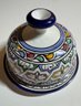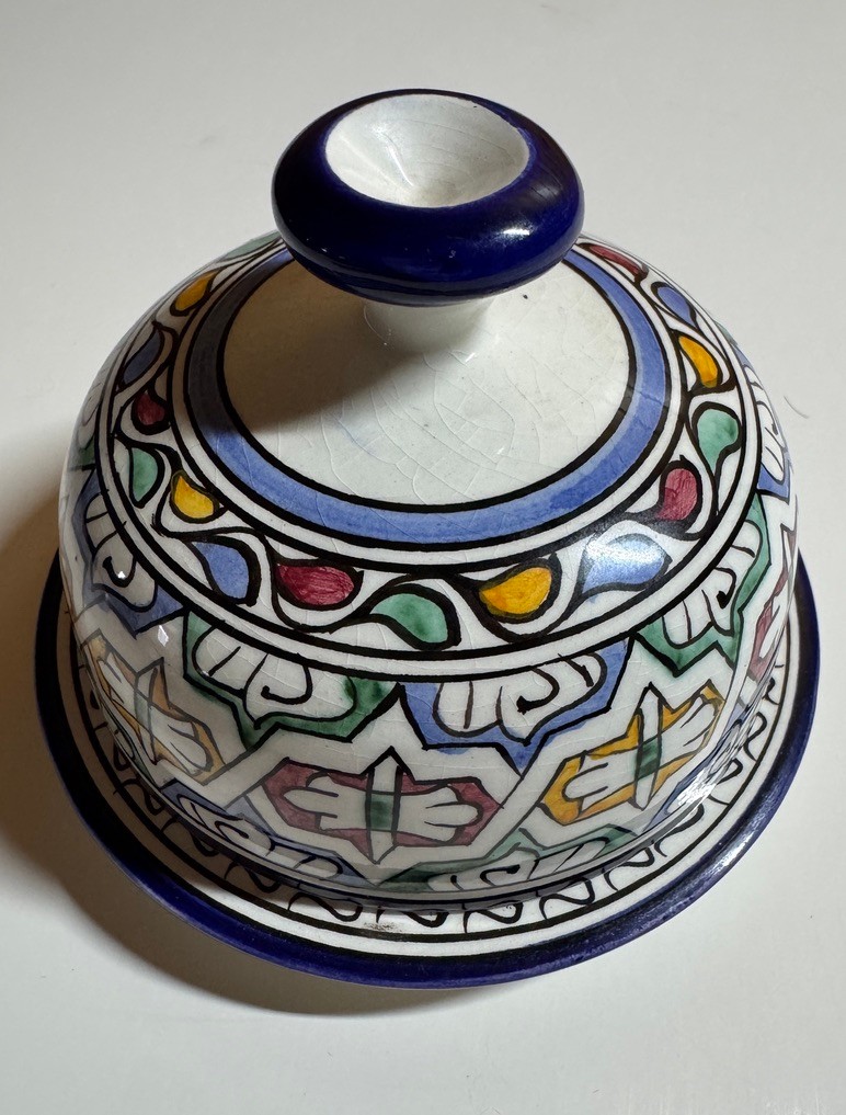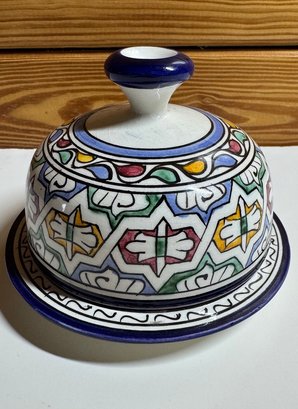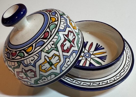 Beautiful hand-painted ceramic covered dish featuring intricate Moroccan geometric and floral motifs in vibrant, multicolor tones. Accented with cobalt blue detailing along the rim and lid, this piece offers both visual appeal and functional versatility.