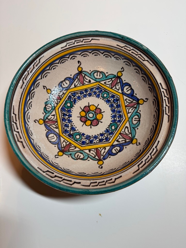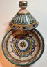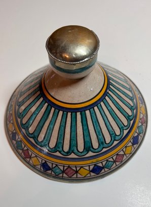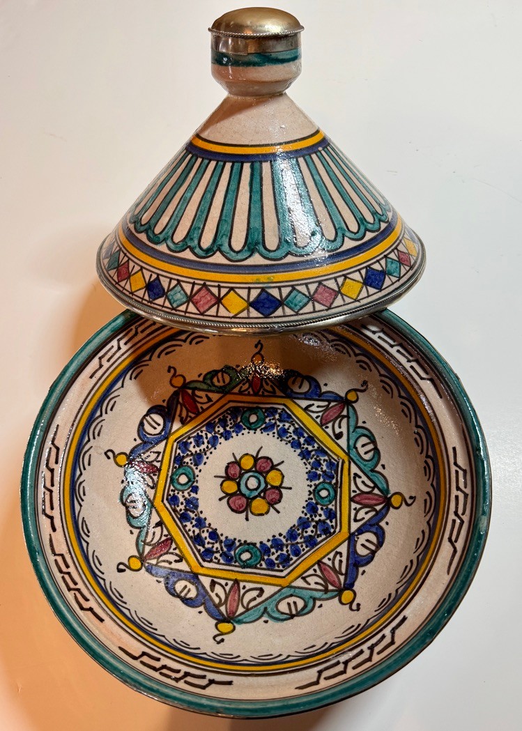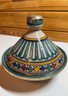 Ceramic tagine featuring a classic conical lid adorned with vibrant hand-painted patterns in teal, mustard, blue, and terracotta tones. The design showcases a mix of geometric and fan motifs, giving the piece a lively, traditional aesthetic.