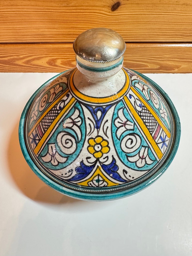 Topped with a rounded knob finial, this tagine makes a striking statement whether used for serving or as a decorative centerpiece.
