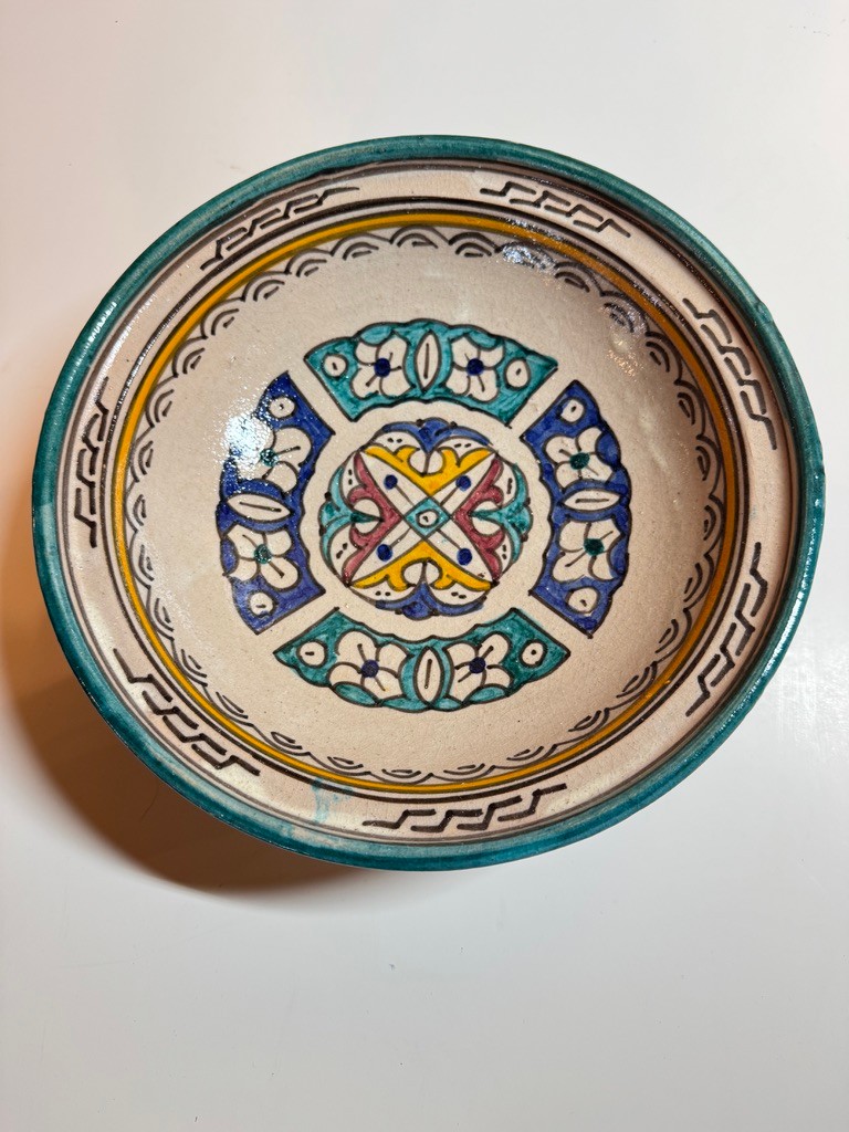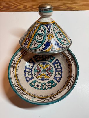 Decorative ceramic tagine featuring a classic conical lid adorned with vibrant hand-painted patterns in teal, mustard, blue, and terracotta tones. The design showcases a mix of geometric and fan motifs, giving the piece a lively, traditional Moroccan- aesthetic.
