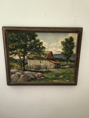 Oil painting of a barn signed N. Olsen 44 which may be the date of the painting. The oil appears to be old, and there are accretions to the surface. Some crazing present.
