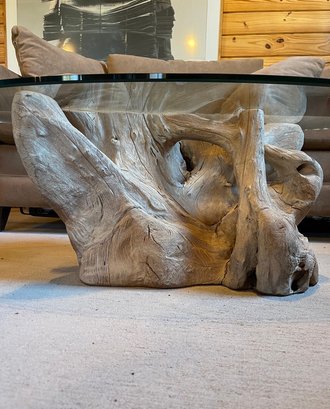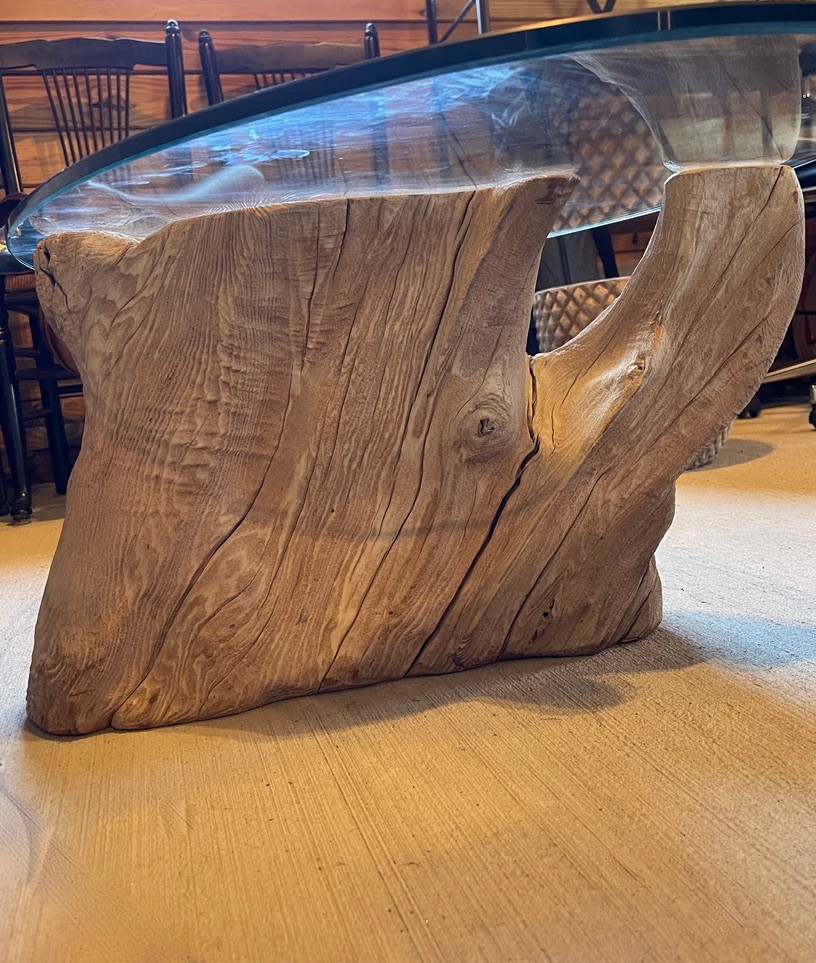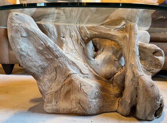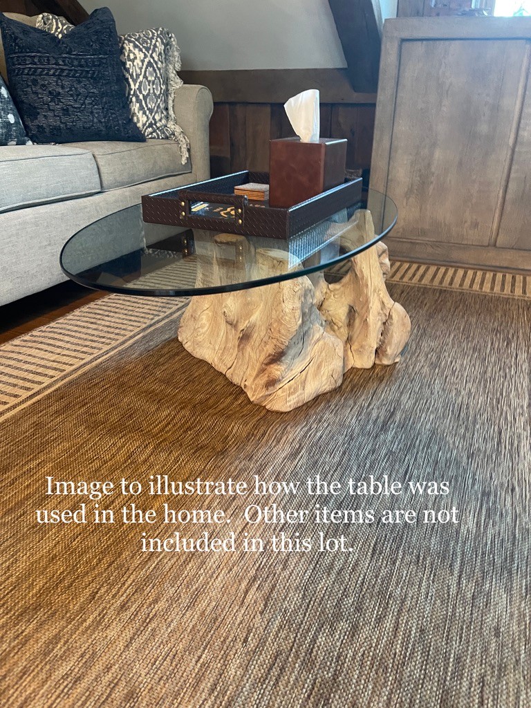 The thick glass top floats above the base, allowing full appreciation of the wood’s natural form while providing a smooth, functional surface. Perfect for coastal, rustic, modern organic, or eclectic interiors.