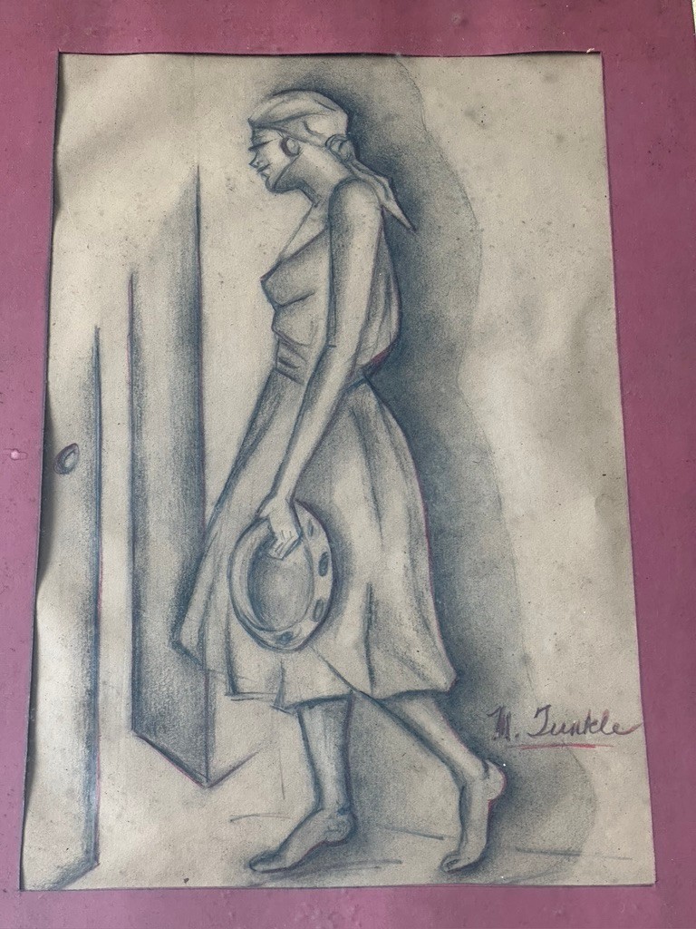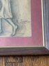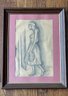 Abstract sketch of a woman in a dress holding a hat. She appears to be walking through a doorway. The artwork is displayed with a pinkish mat with a thin gold banded wood frame. The sketch is vintage, likely from the 1950's.