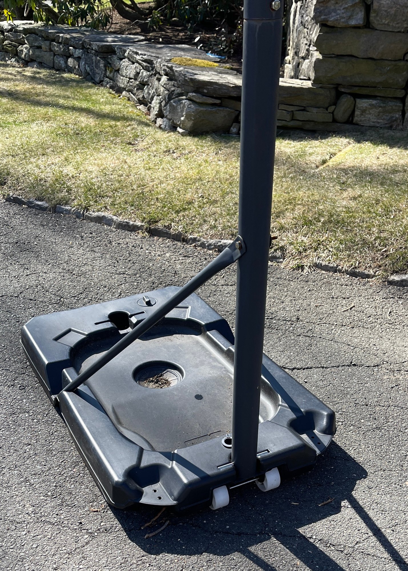 The hoop includes a clear backboard with a classic design, a standard rim with net, and a sturdy base that can be filled with water or sand for stability. Built-in wheels make it easy to move and reposition as needed.