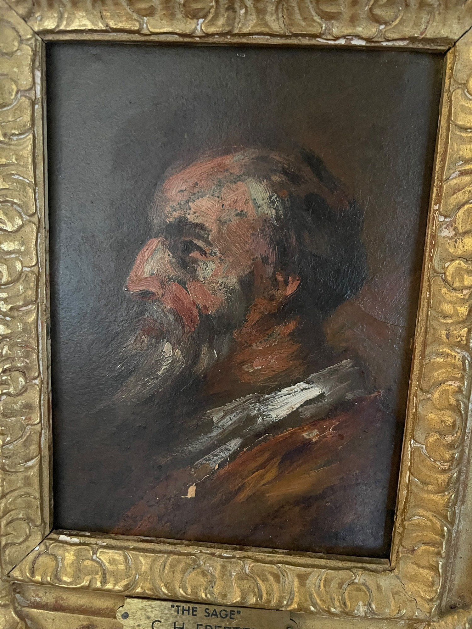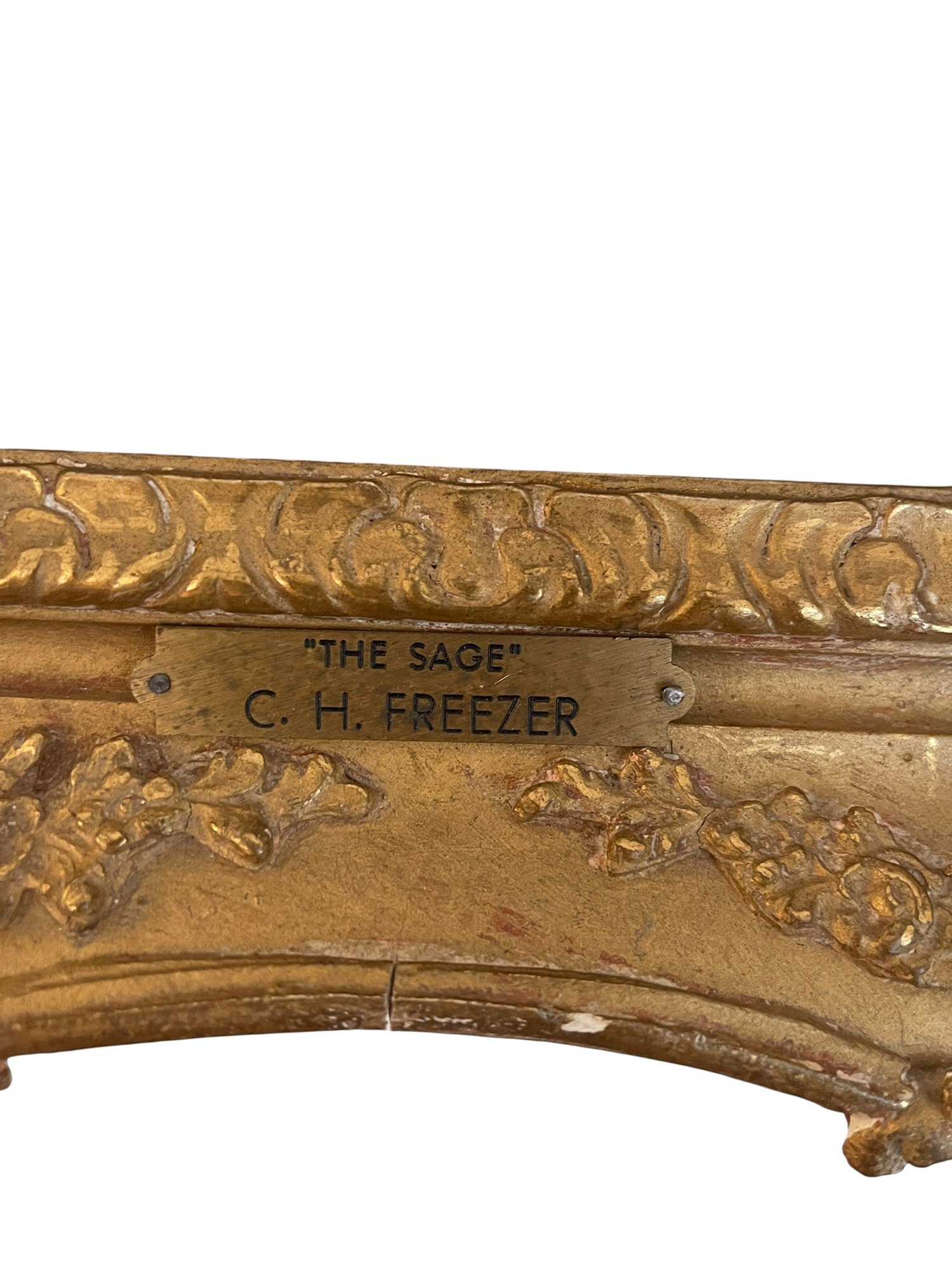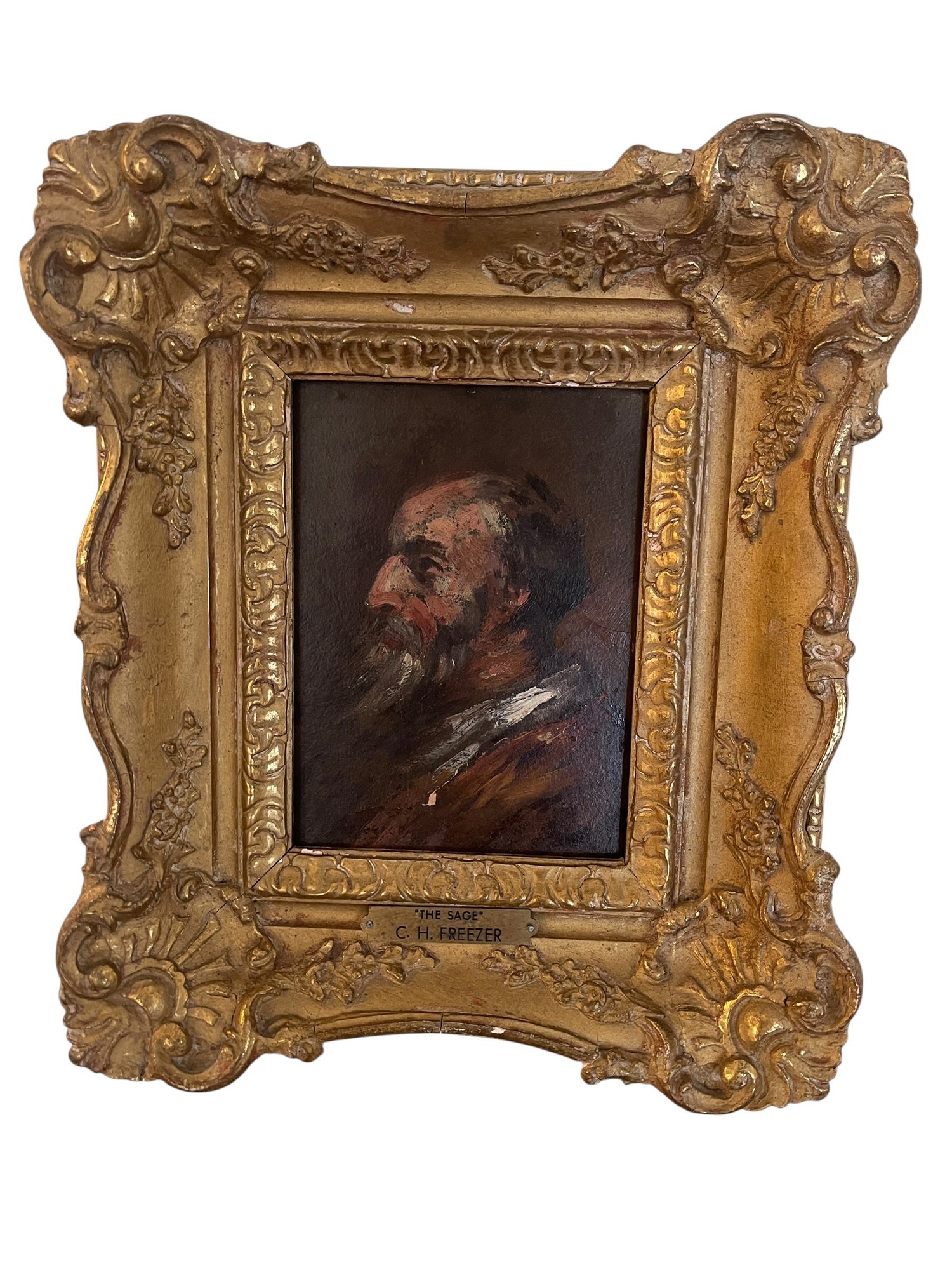 19th century portrait of a bearded man in profile. The painting is framed in an ornate, decorative gold-toned frame.