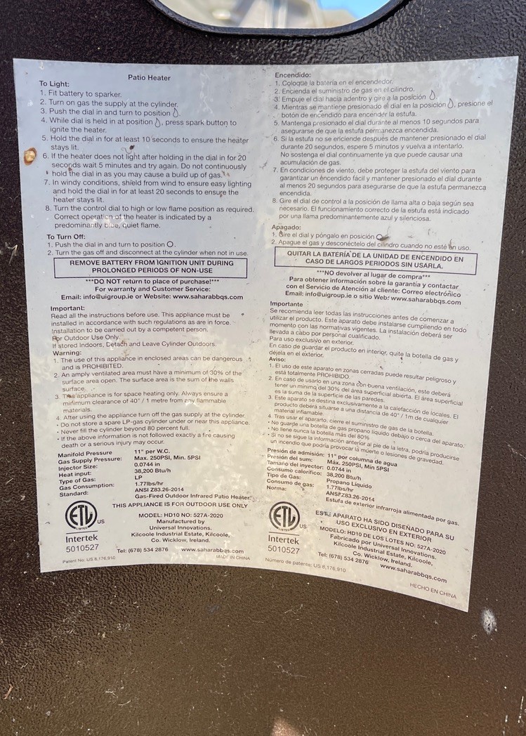 The base houses the propane tank (included) and is equipped with wheels for easy mobility. A convenient access door allows for simple tank installation and removal.