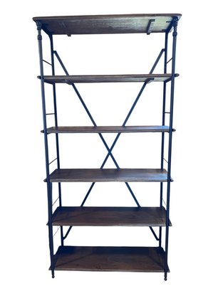 Attractive industrial-style shelving unit featuring a black metal frame paired with rich, dark wood shelves. This open bookcase offers a clean, architectural look with X-form back supports for added stability and visual interest.