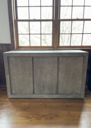 A substantial RH rustic-style storage chest or console crafted in a weathered gray wood finish. The piece features a clean, rectangular form with recessed panel detailing across the front three doors, giving it a tailored yet relaxed look. This piece works well with modern farmhouse, coastal, or transitional interiors.