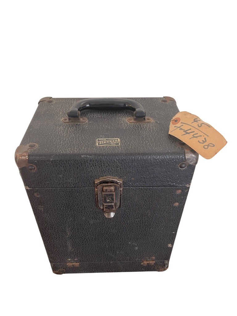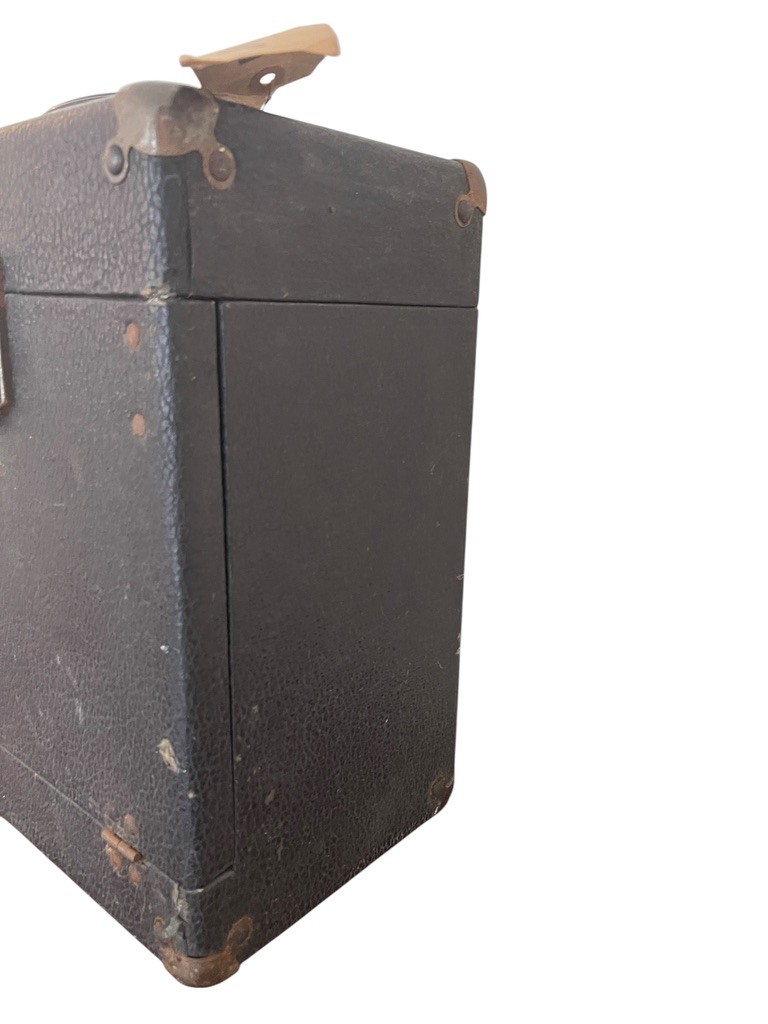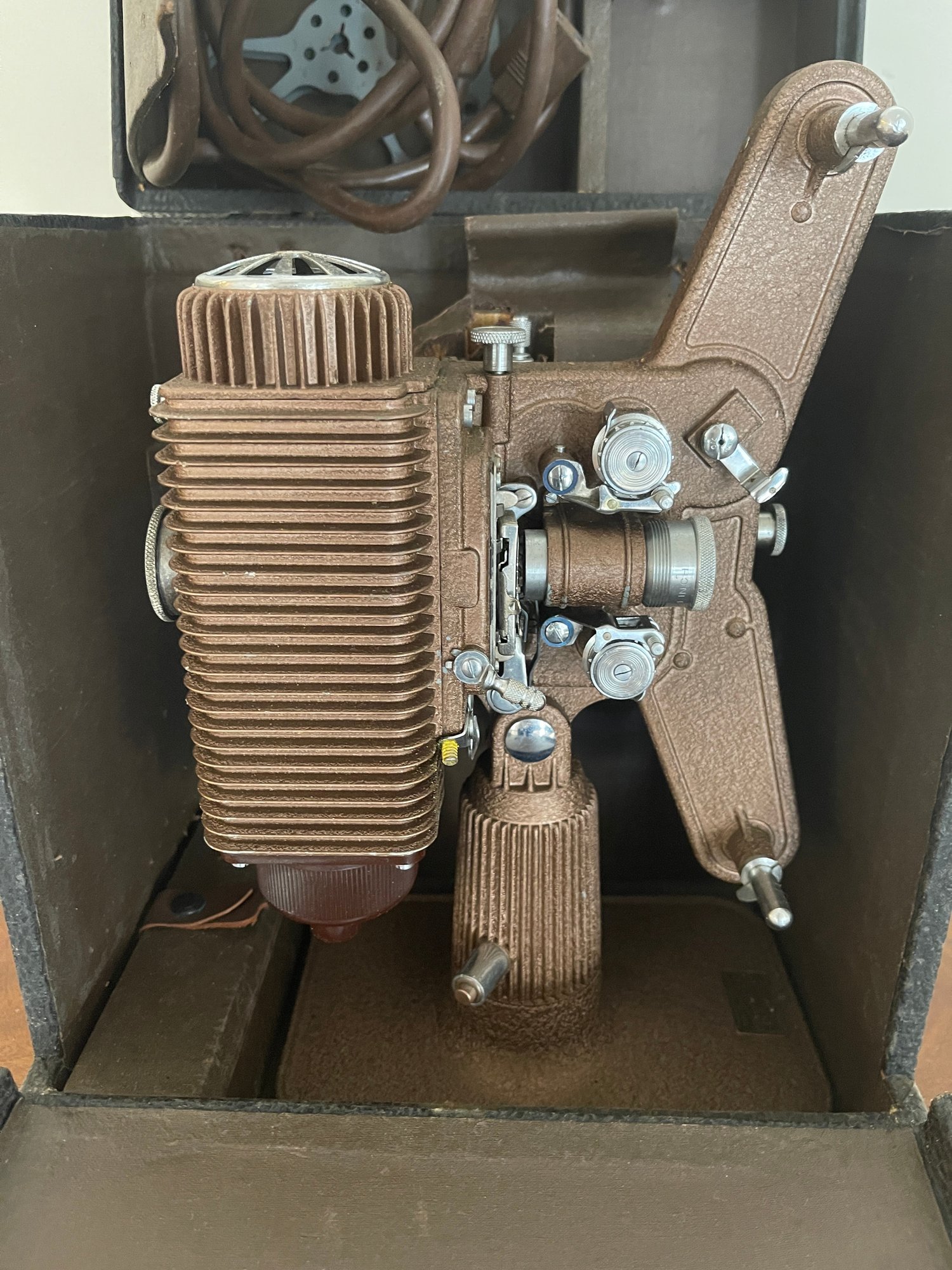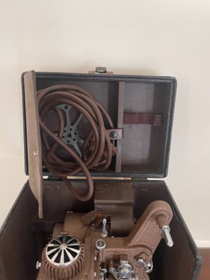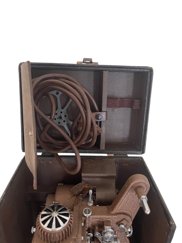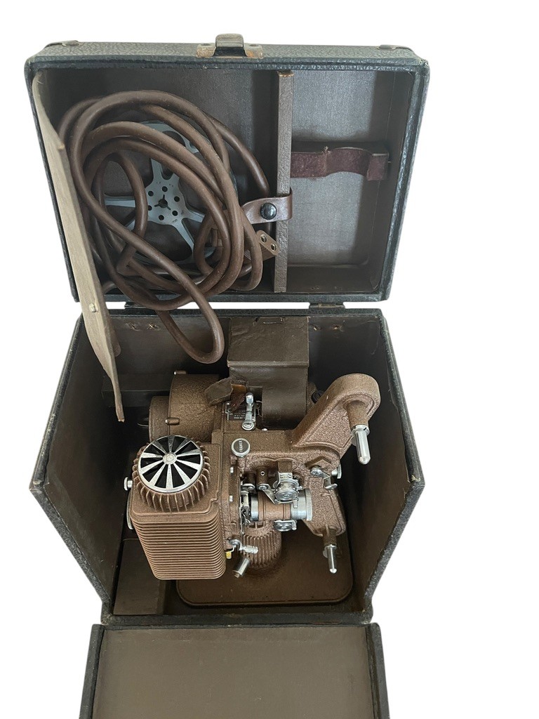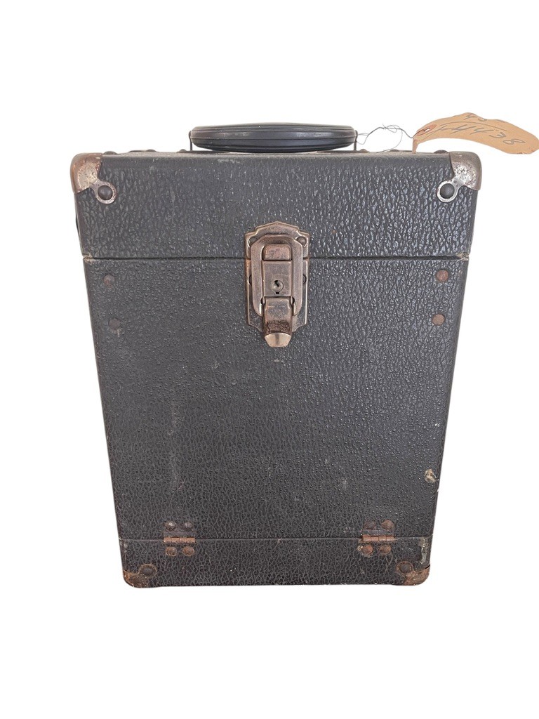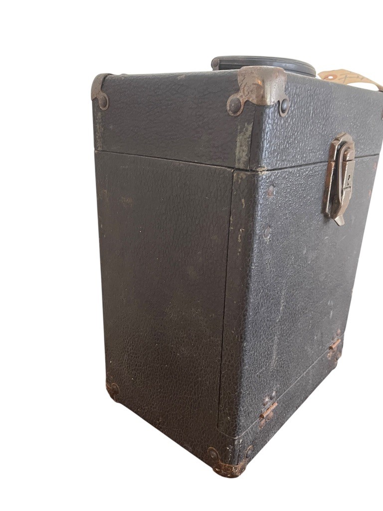 Vintage Revere 8mm movie projector, likely Model 85 designed for viewing 8mm film reels popular in the 1940's and 50's housed in a hard travel case for portability.