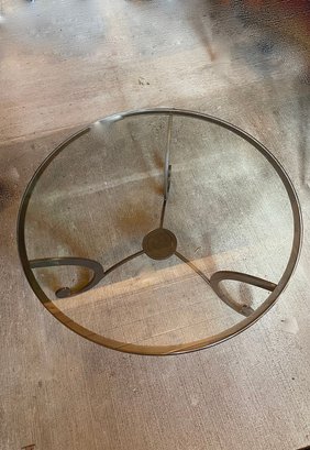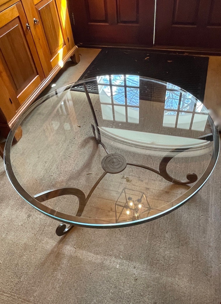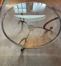 Elegant round coffee table featuring a clear glass top supported by a decorative metal base. The base showcases gracefully curved scroll legs connected by a central medallion, creating a light and airy look with classic appeal.