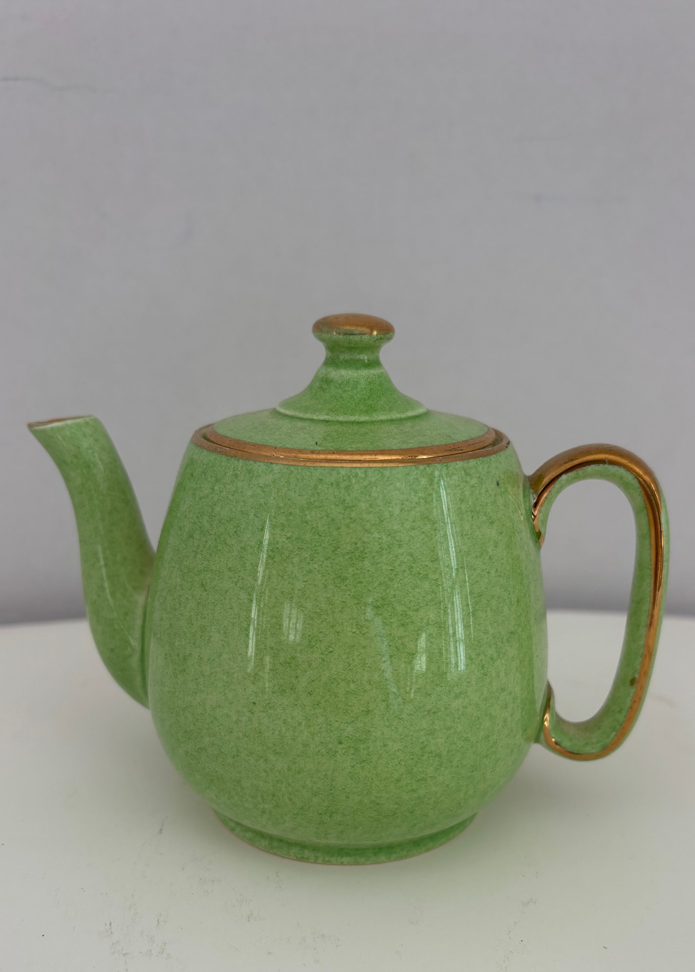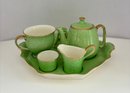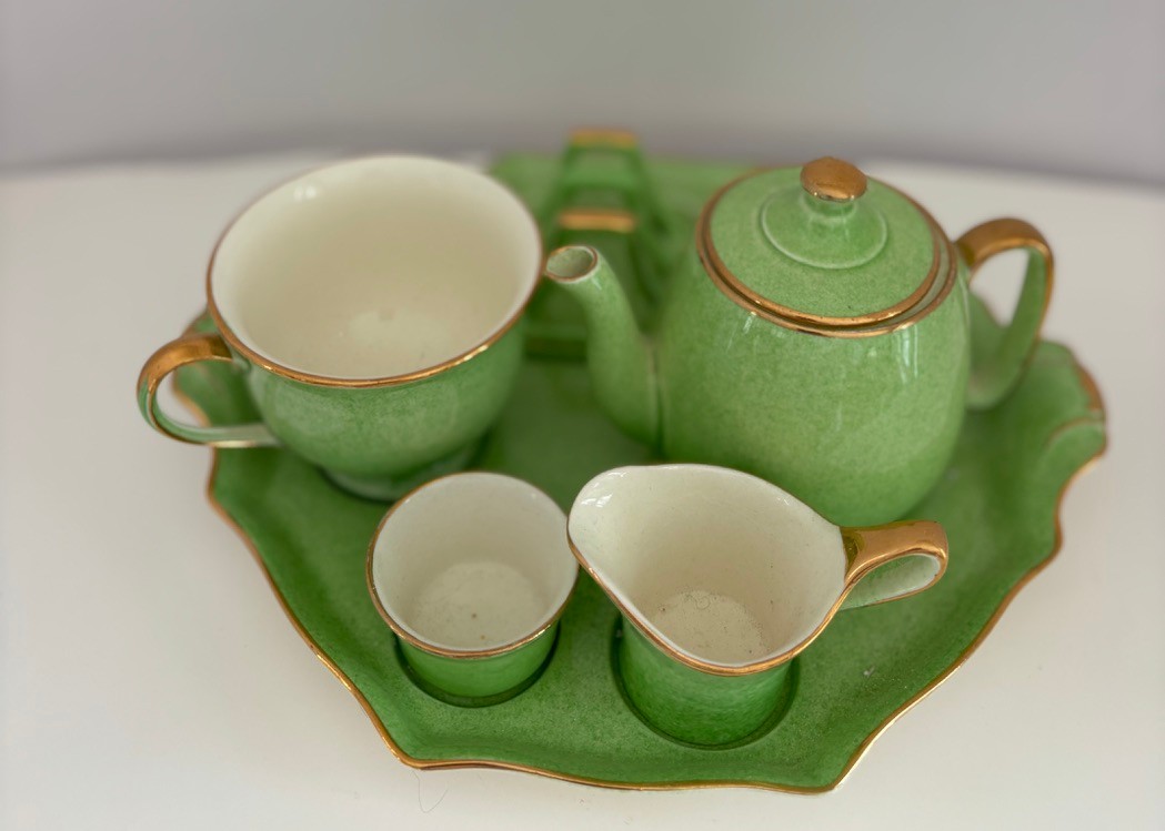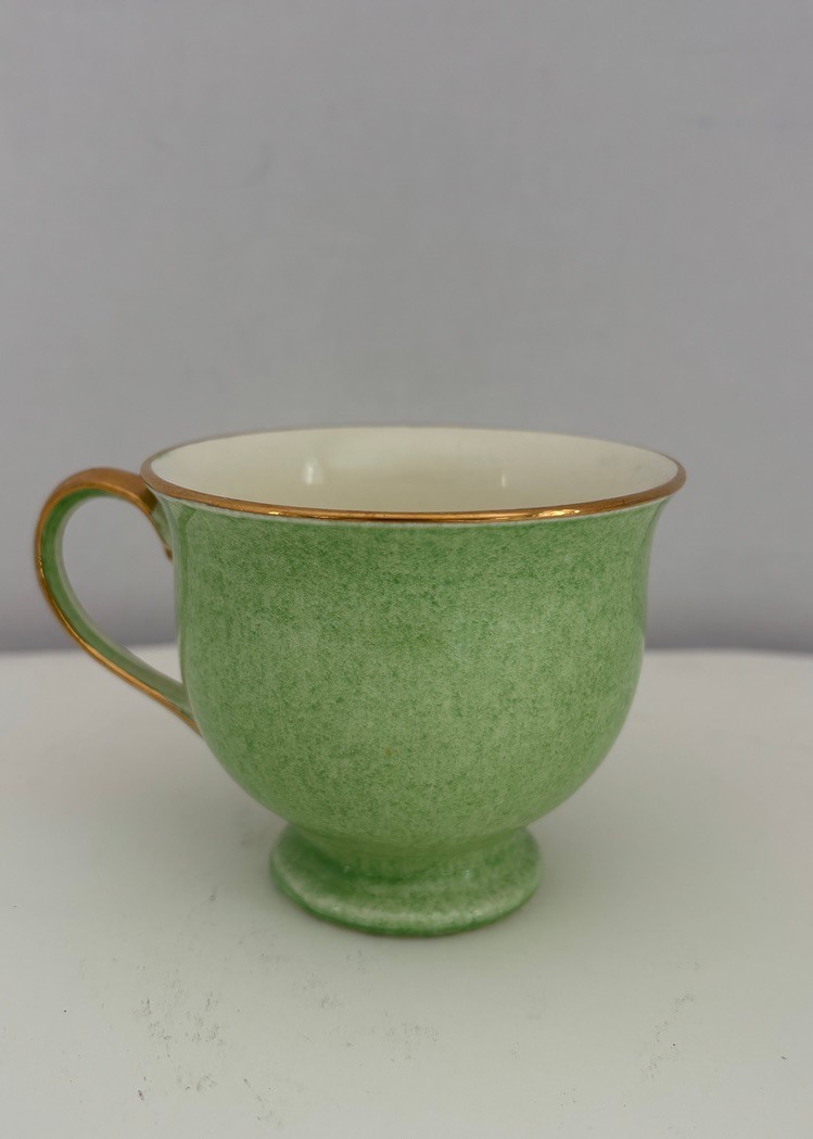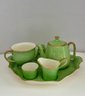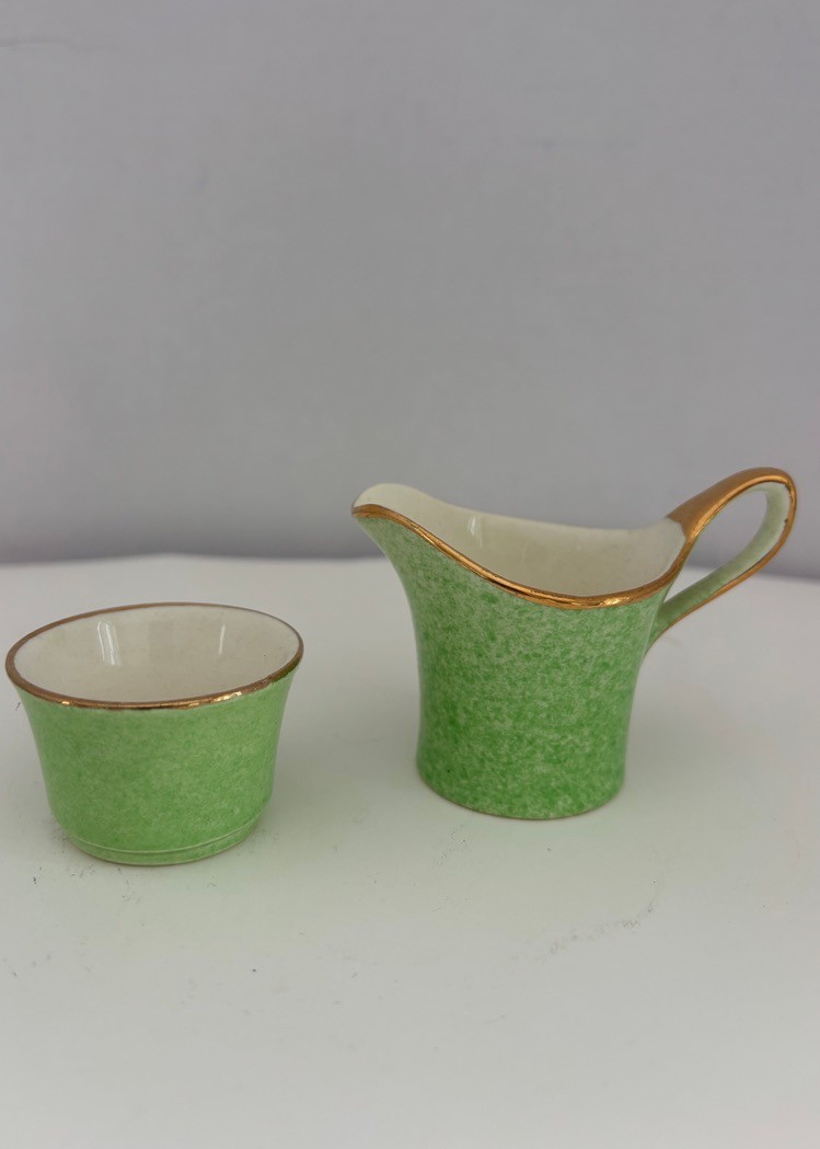 Vintage Royal Winton Grimwades "Countess" breakfast set featuring a mottled green glazed with gold trim made in England likely 1930's-1550's.
