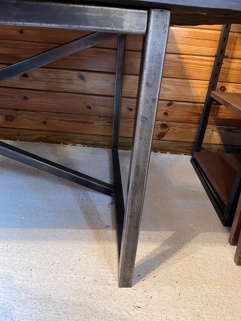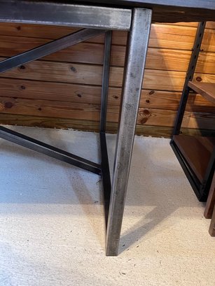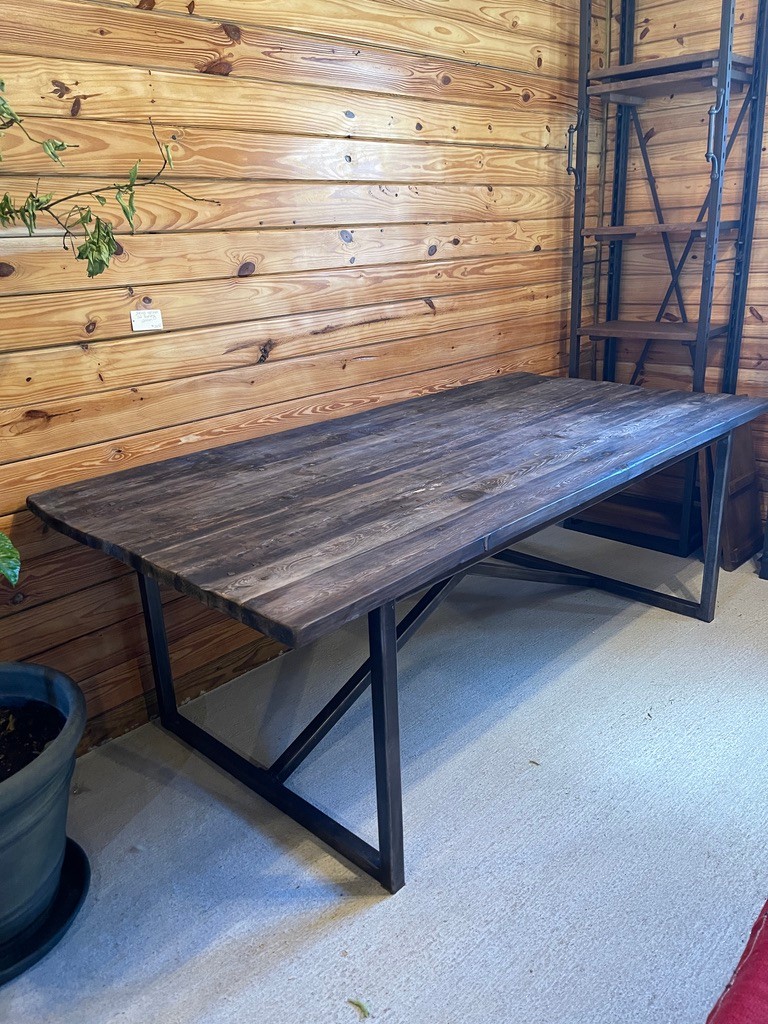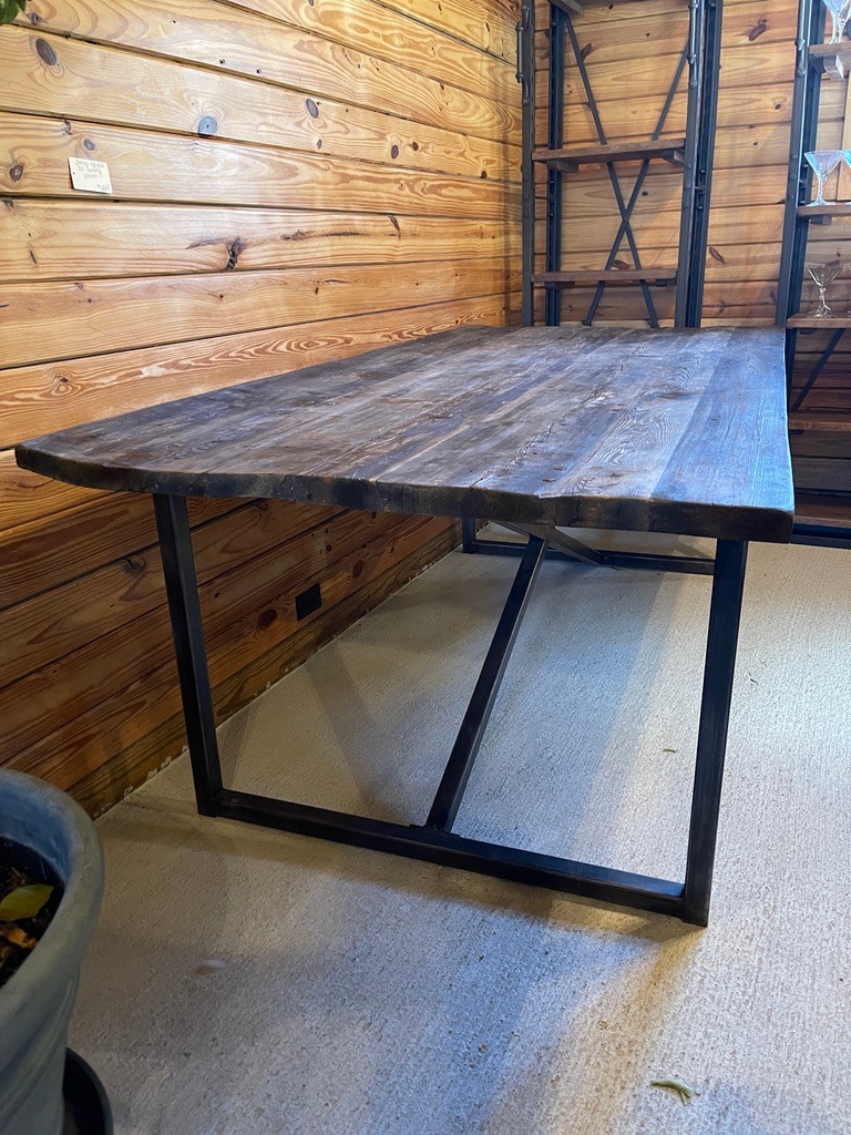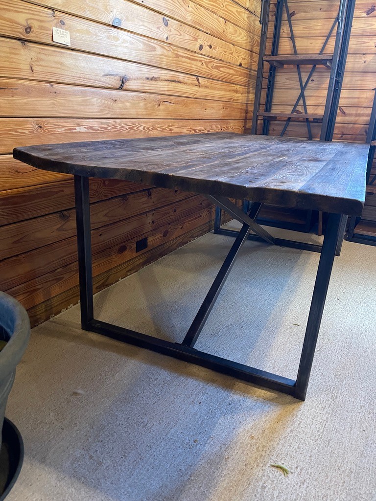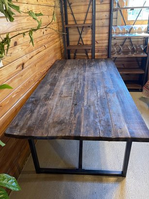 Striking rustic-industrial dining table featuring a thick plank wood top paired with a bold black sturdy metal base. The top showcases rich natural grain, knots, and character, giving the piece a warm, organic feel, while the clean-lined steel base adds a modern, architectural edge.