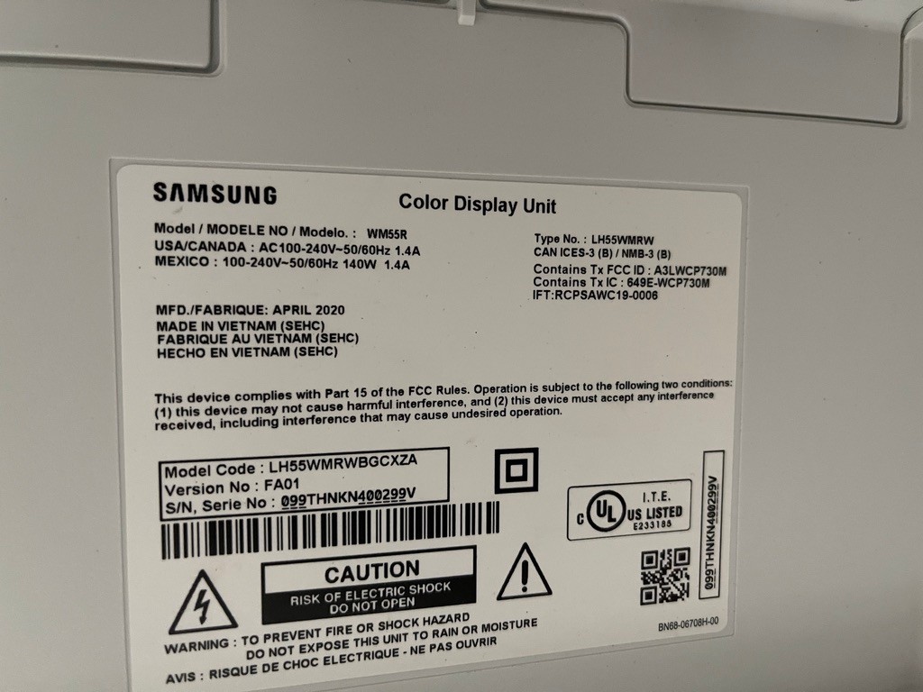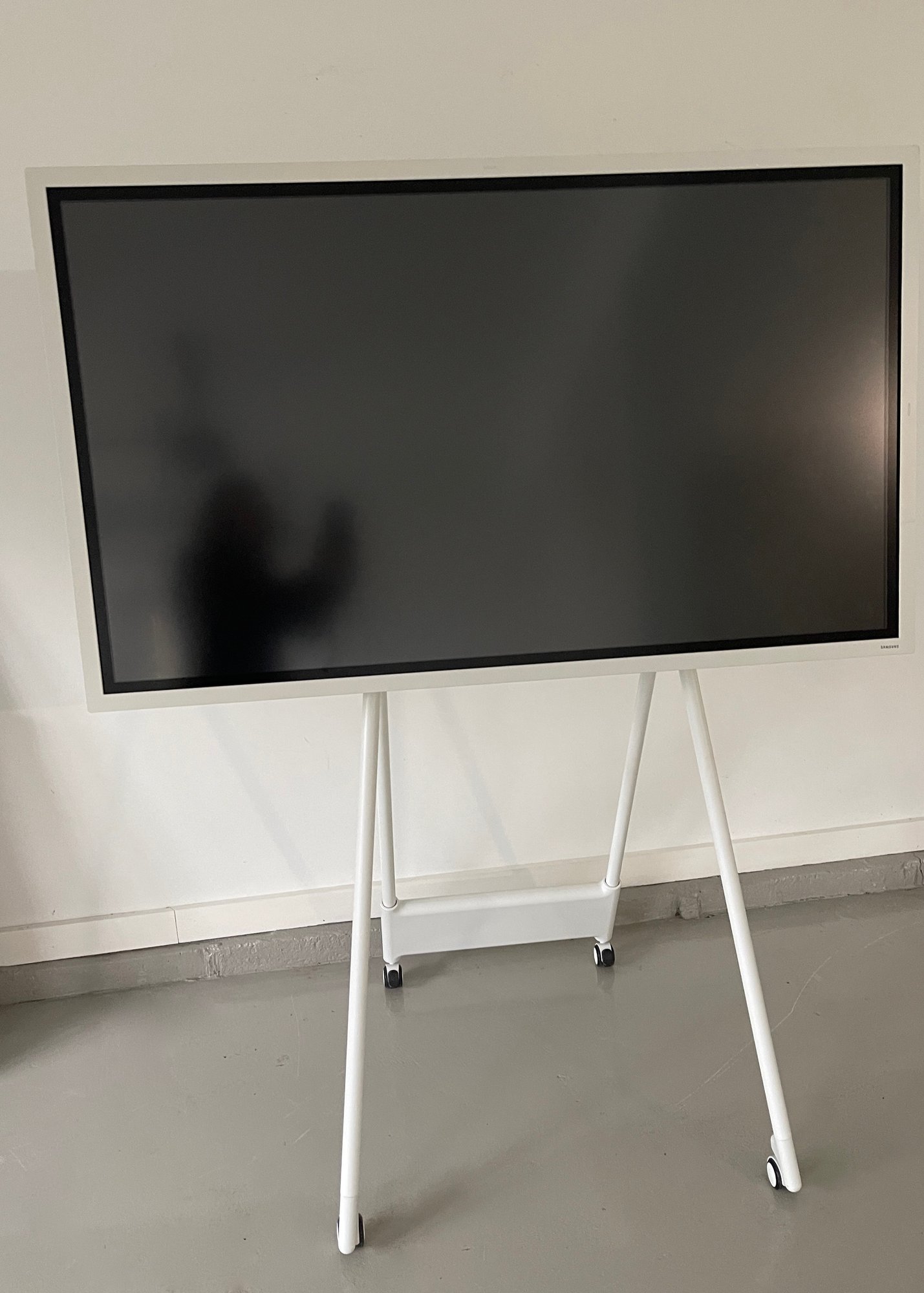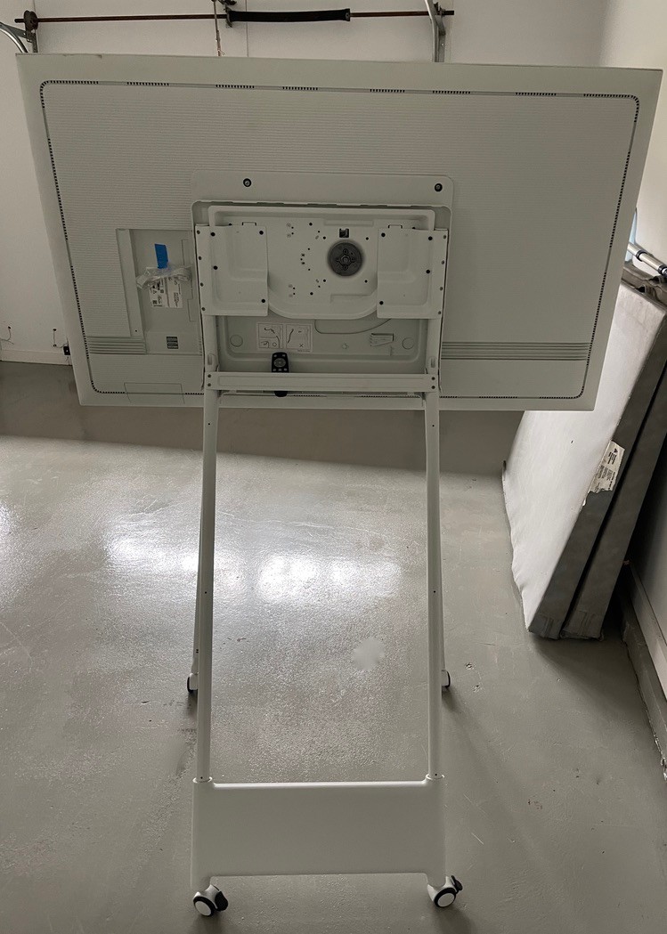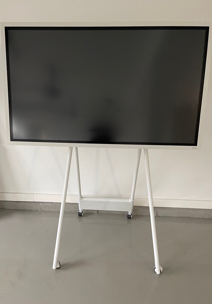 Samsung Color Display Unit with minimalist white frame and high resolution monitor. The unit includes a modern tripod-style rolling floor stand, blending technology with contemporary furniture design. There is another brand new in the box Samsung unit in this auction.