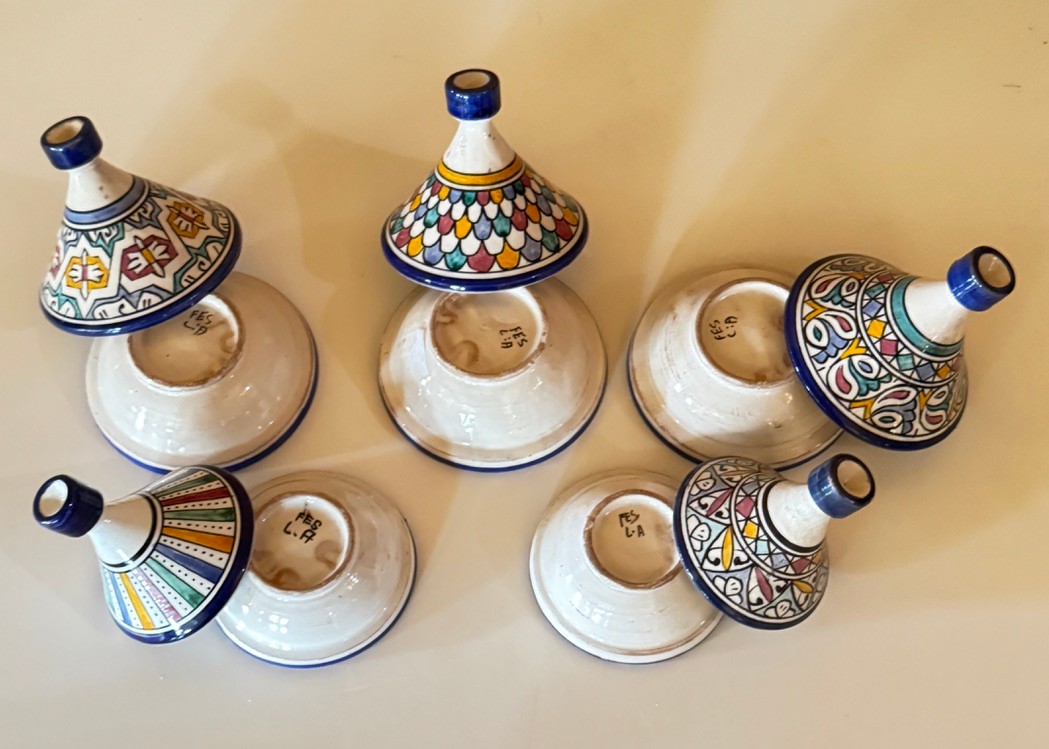 Each tagine includes a fitted conical lid and shallow base, making them perfect for serving condiments, spices, or small bites—or simply as decorative accents.