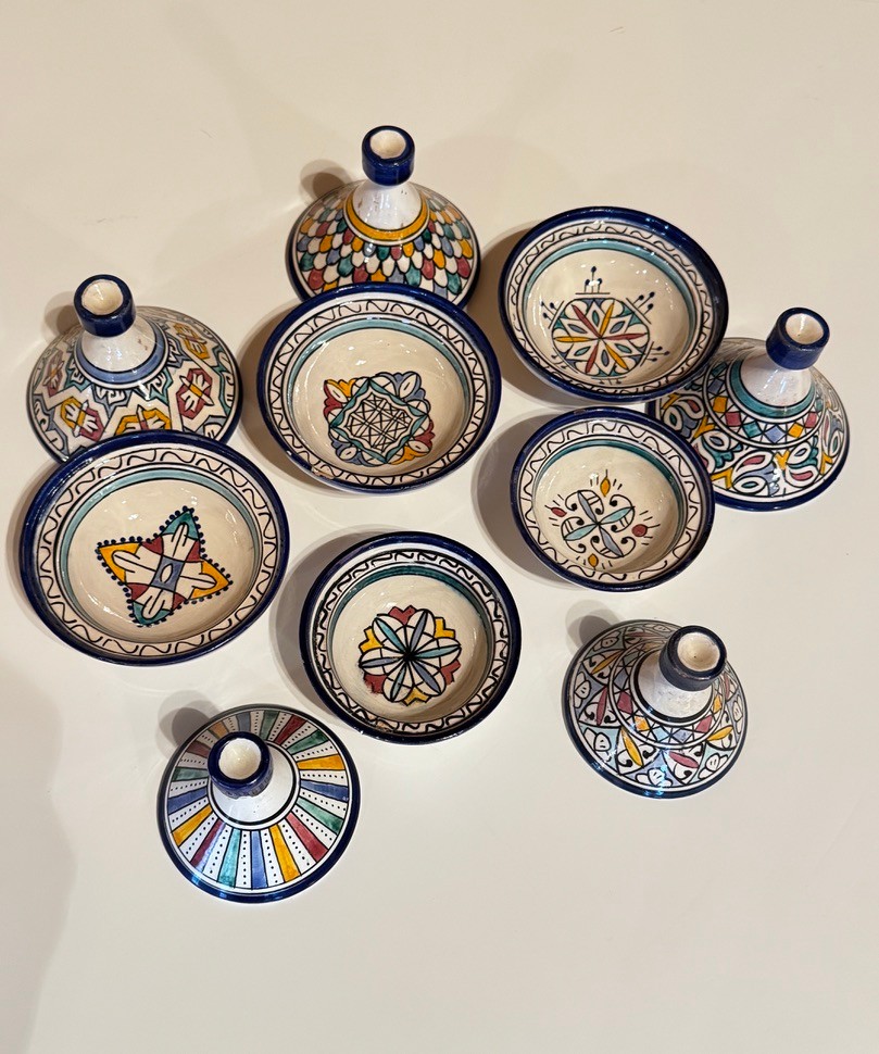 Charming set of five decorative mini tagine dishes, each hand-painted in vibrant, traditional Moroccan patterns. Featuring colorful geometric and floral motifs with cobalt blue accents, these pieces bring a lively, global touch to any table or display.