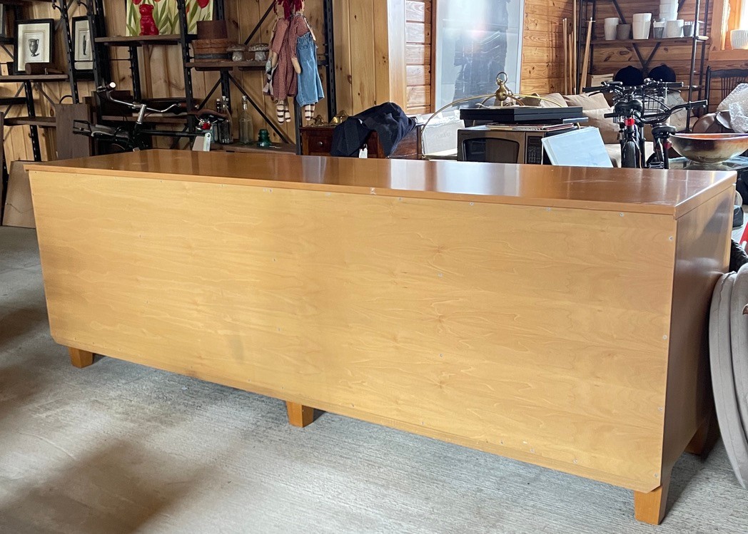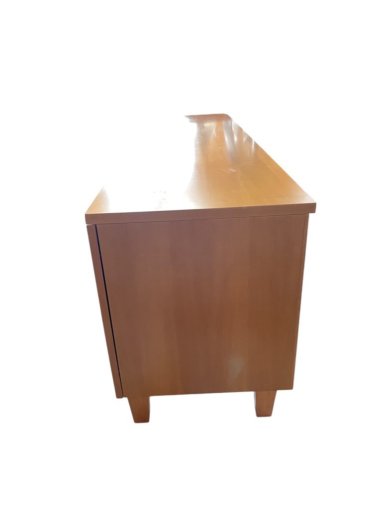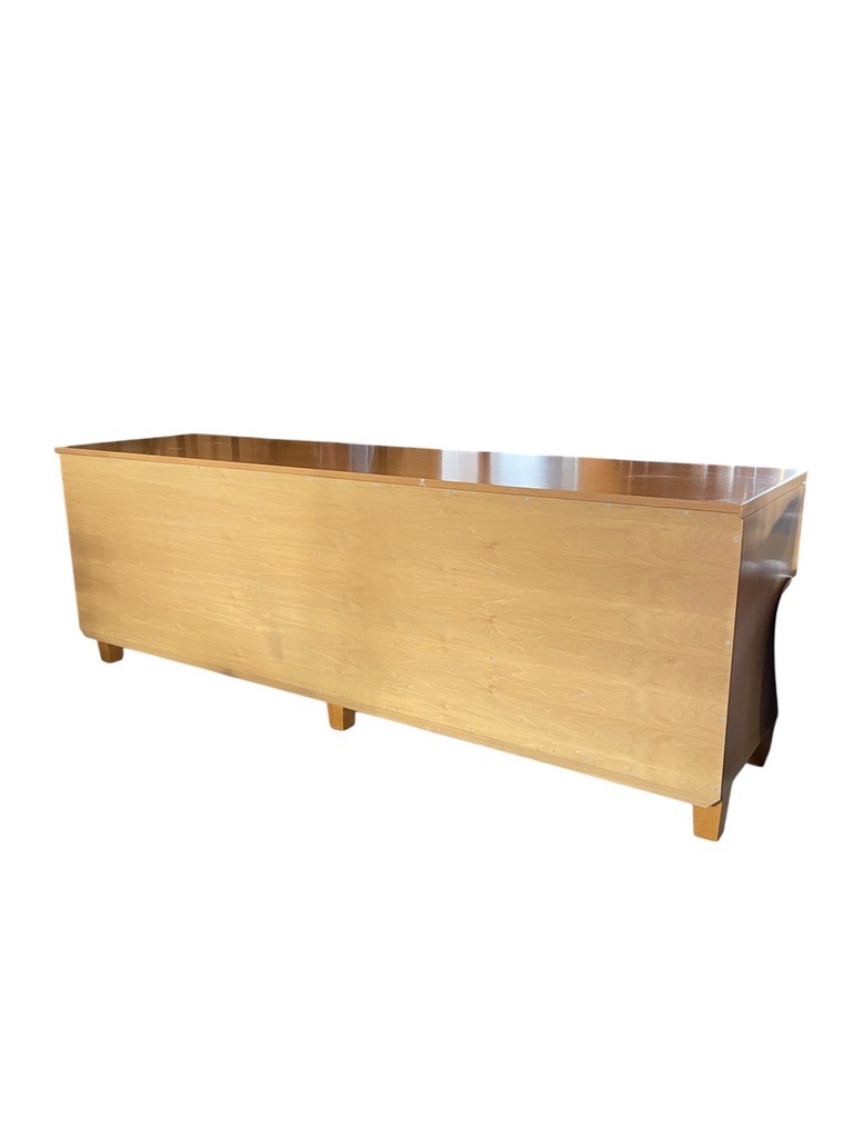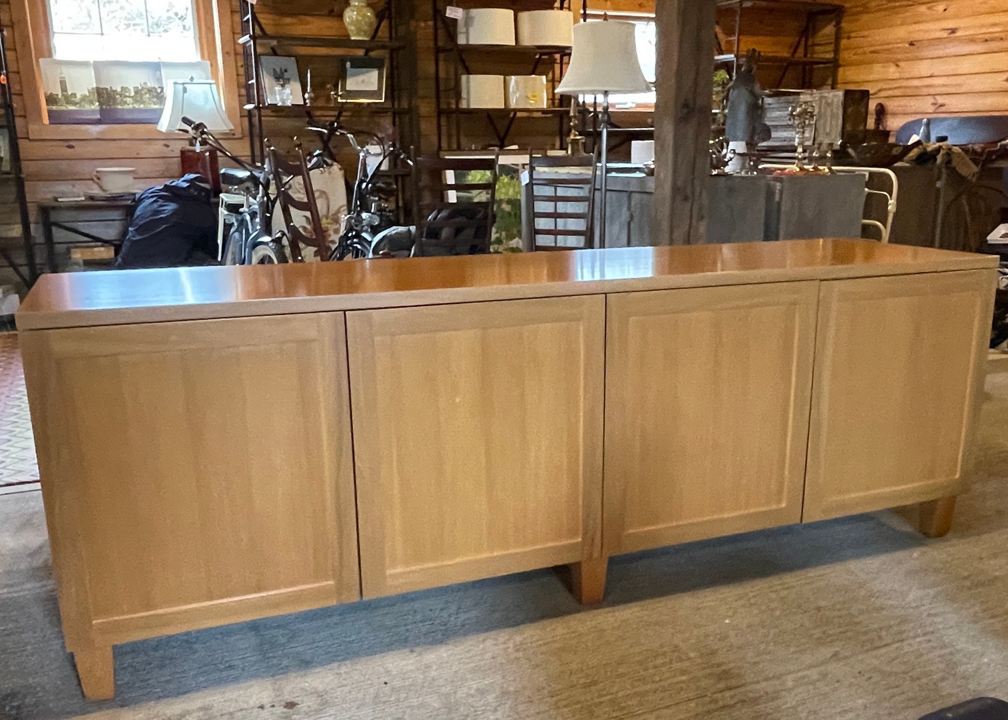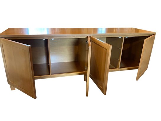 This is a timeless and highly functional piece that works seamlessly in a variety of interiors. Custom, substantial and beautifully crafted contemporary credenza featuring clean architectural lines and a warm natural wood finish. This versatile storage piece offers both function and understated elegance, making it ideal for use as a dining room sideboard, media console, or office cabinet.